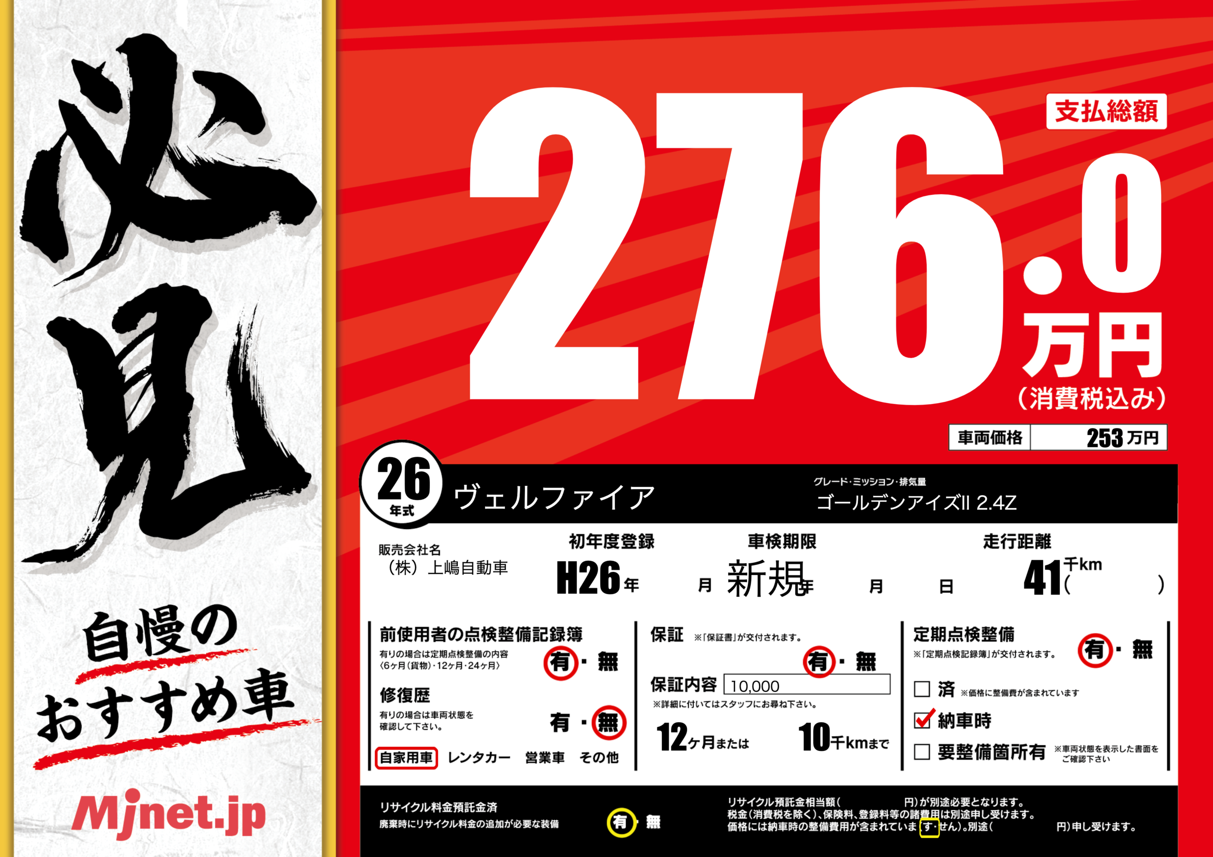 | 車名 | ヴェルファイア | グレード ミッション 排気量 |