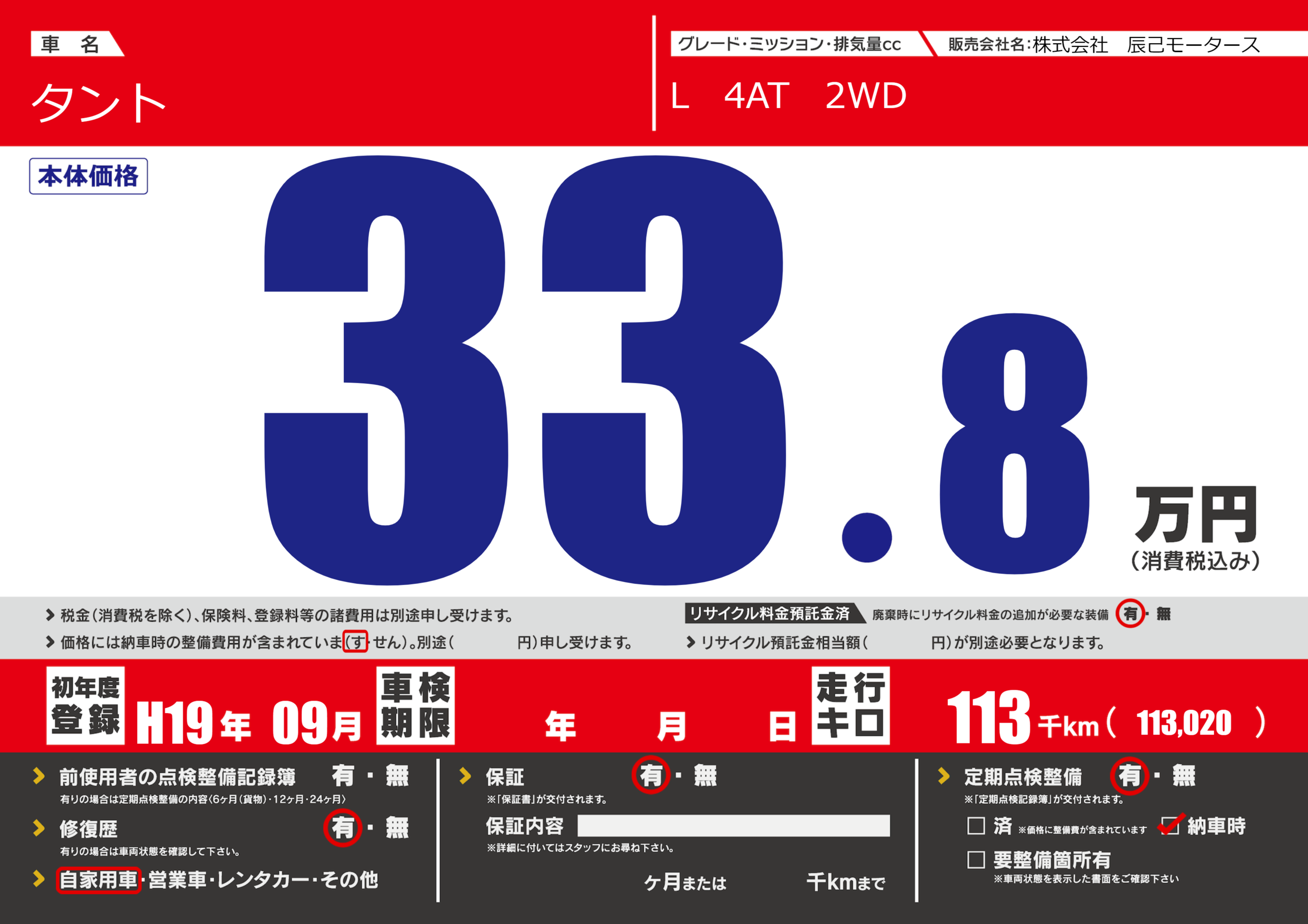 | 走行キロ | 11.3万km | 初年度登録 | H19年09月 |