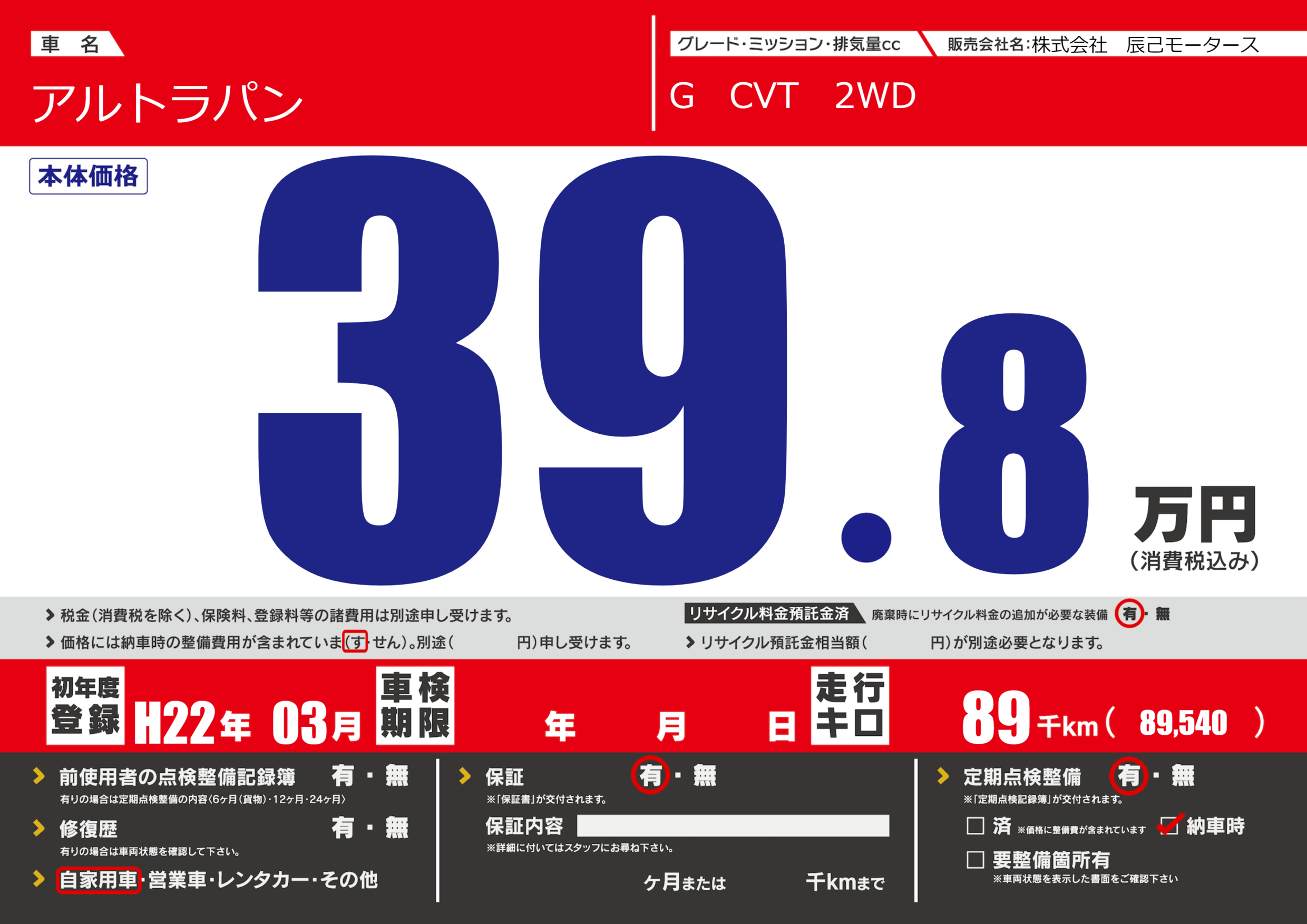 | 走行キロ | 8.9万km | 初年度登録 | H22年03月 |