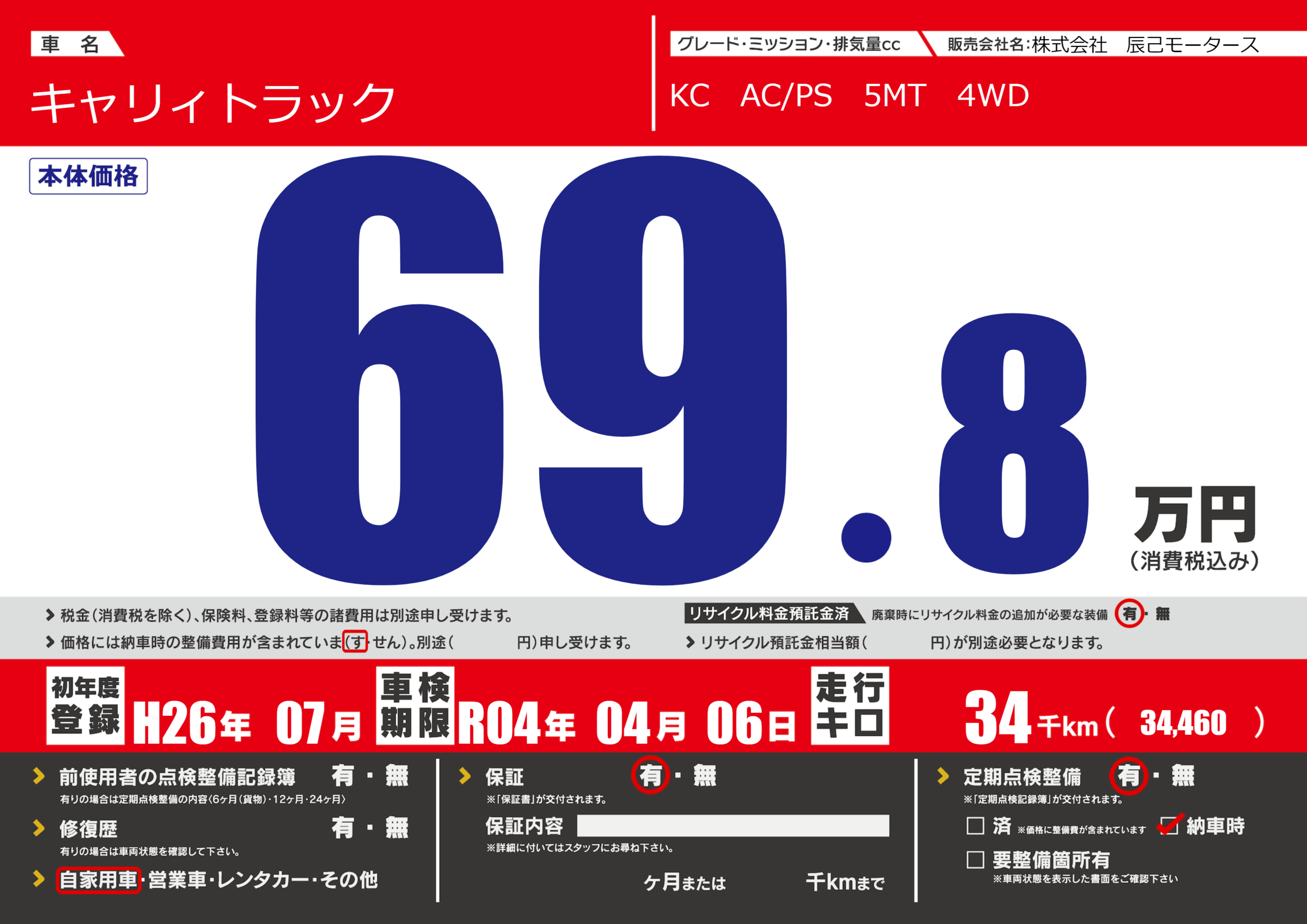 | 定期点検整備 | 定期点検整備あり 納車時あり | ||