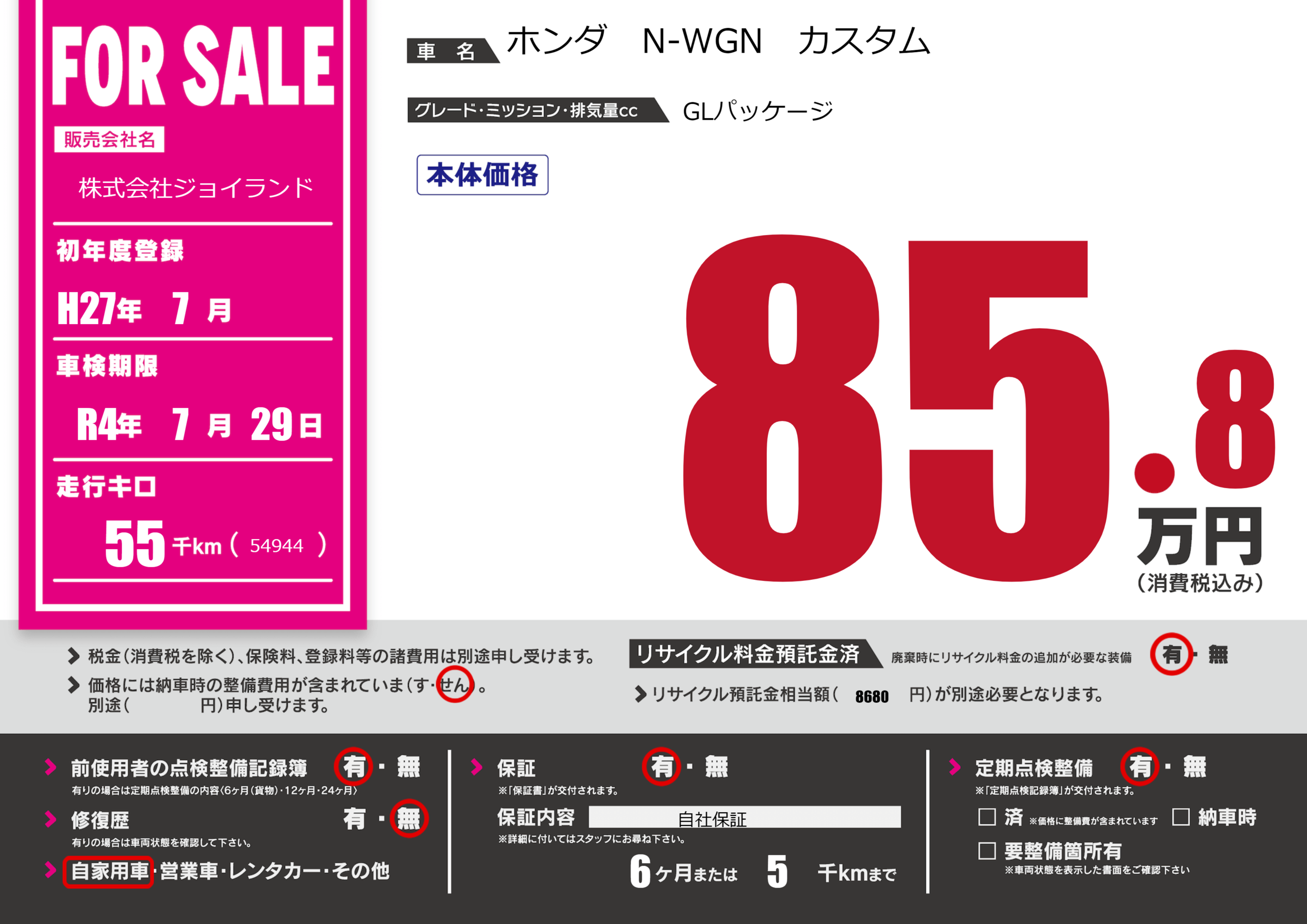 | 車名 | ホンダ N-WGN カスタム | グレード ミッション 排気量 |