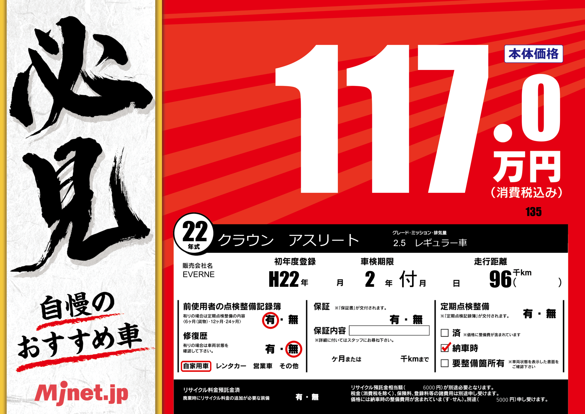 | 車名 | クラウン アスリート | グレード ミッション 排気量 |