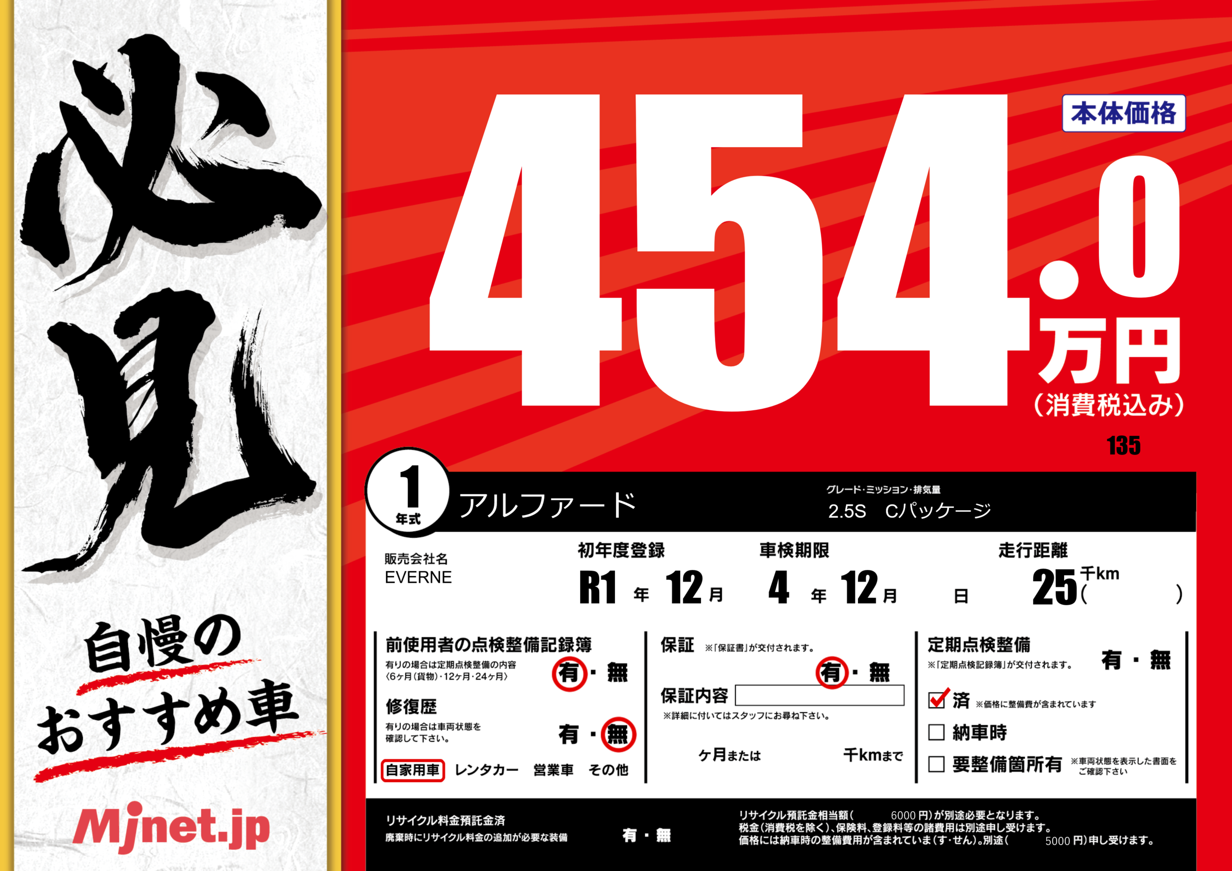 | 定期点検整備 | 定期点検整備済み | ||