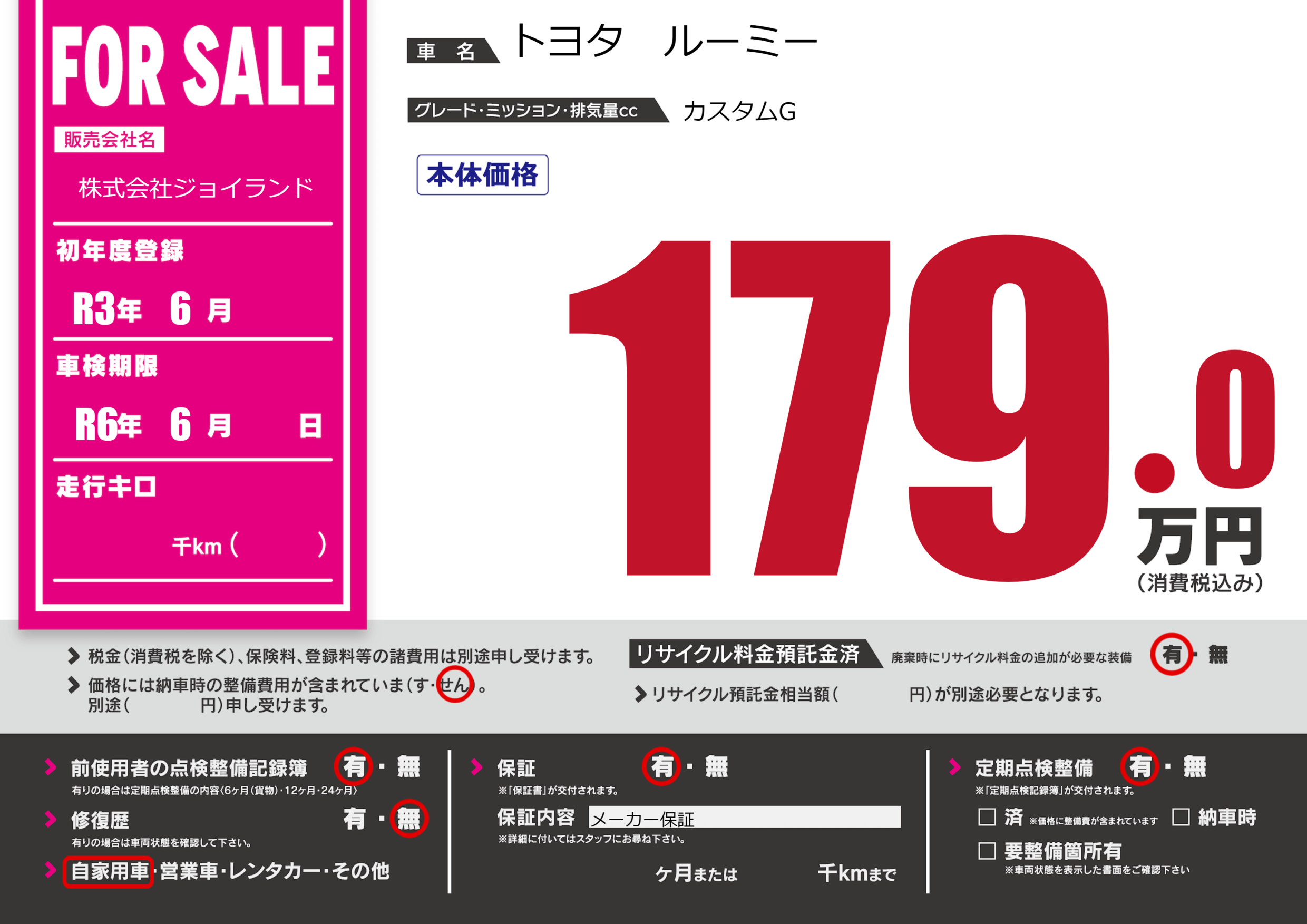 | 車名 | トヨタ ルーミー | グレード ミッション 排気量 |