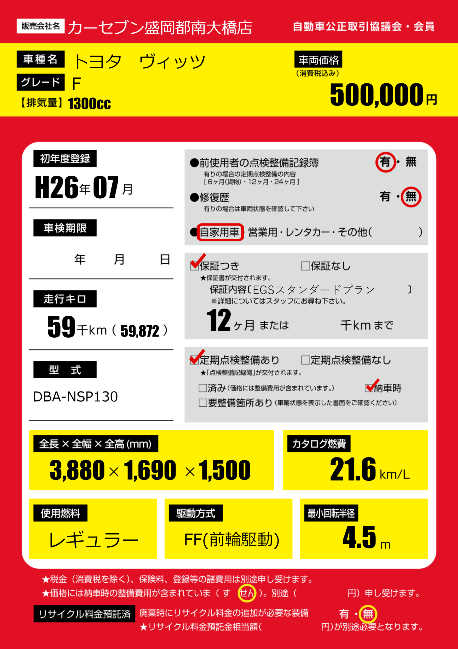 | 車名 | トヨタ ヴィッツ | グレード ミッション 排気量 |