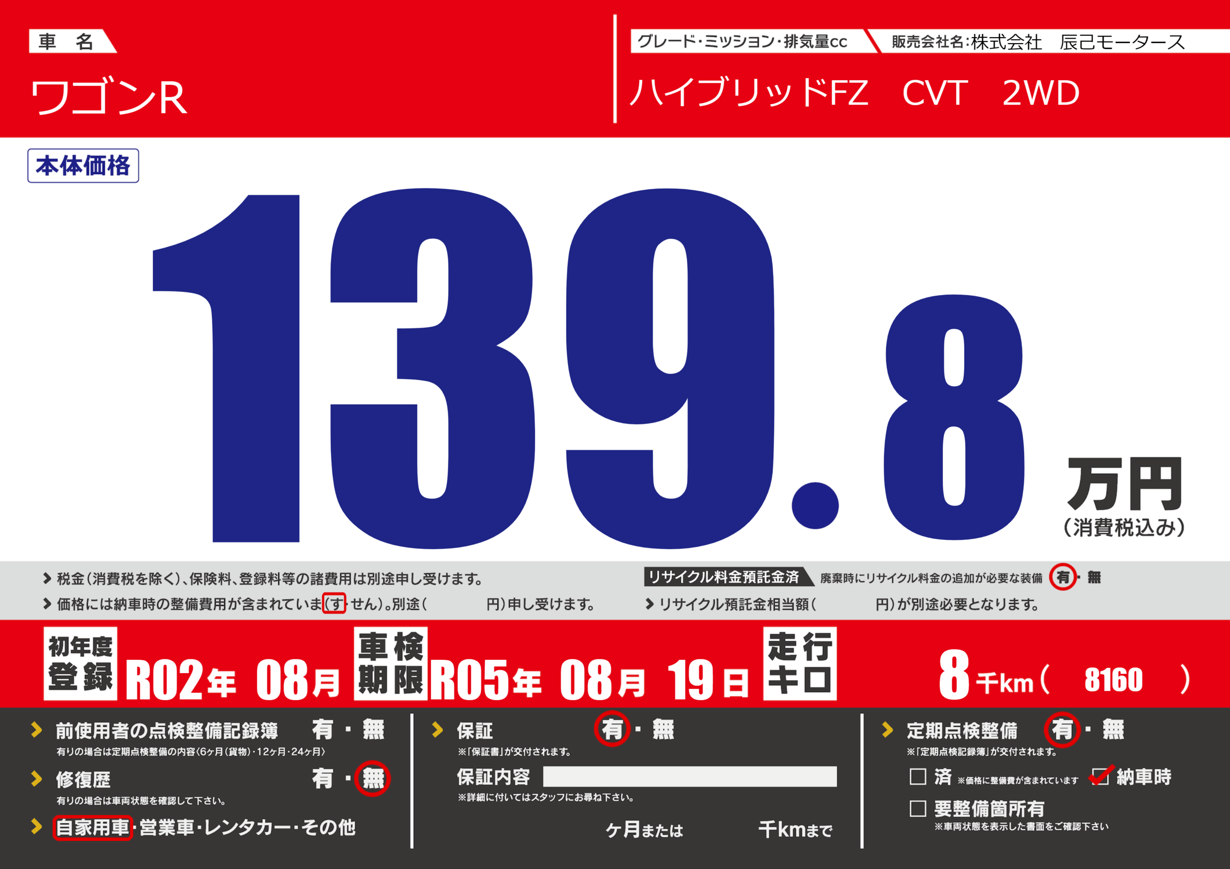 | 走行キロ | 0.8万km | 初年度登録 | R02年08月 |