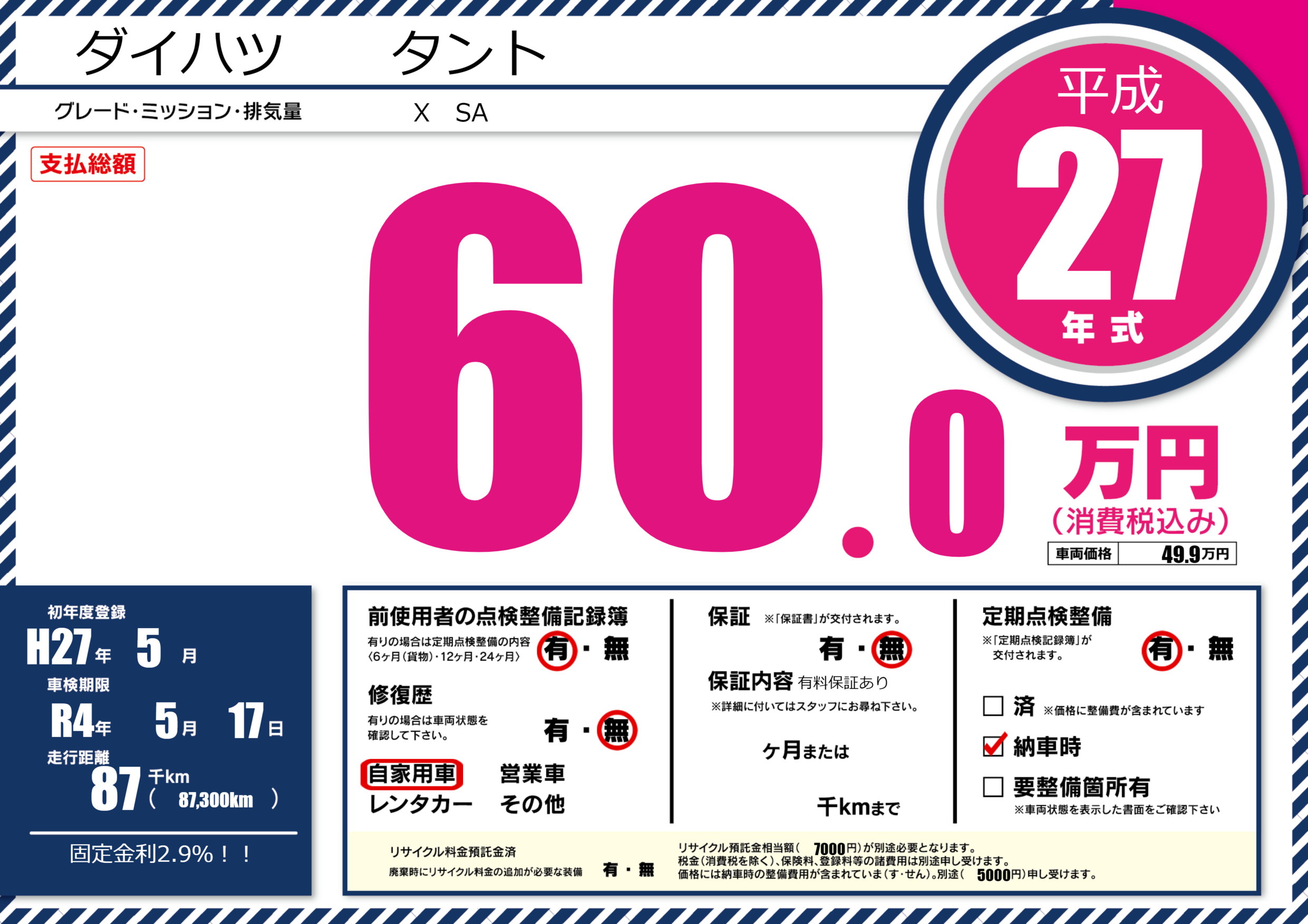 | 走行キロ | 8.7万km | 初年度登録 | H27年5月 |