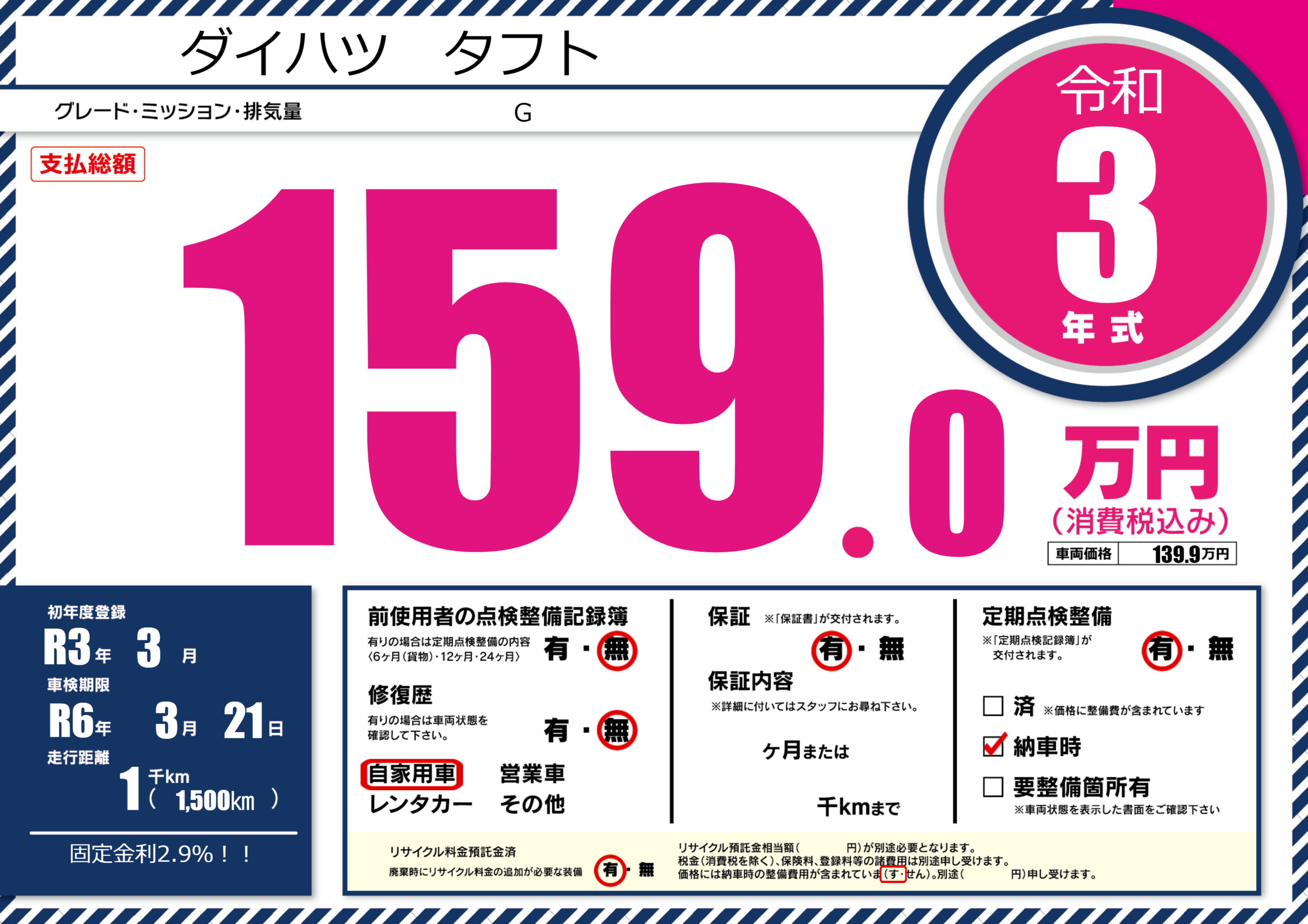 | 走行キロ | 0.1万km | 初年度登録 | R3年3月 |