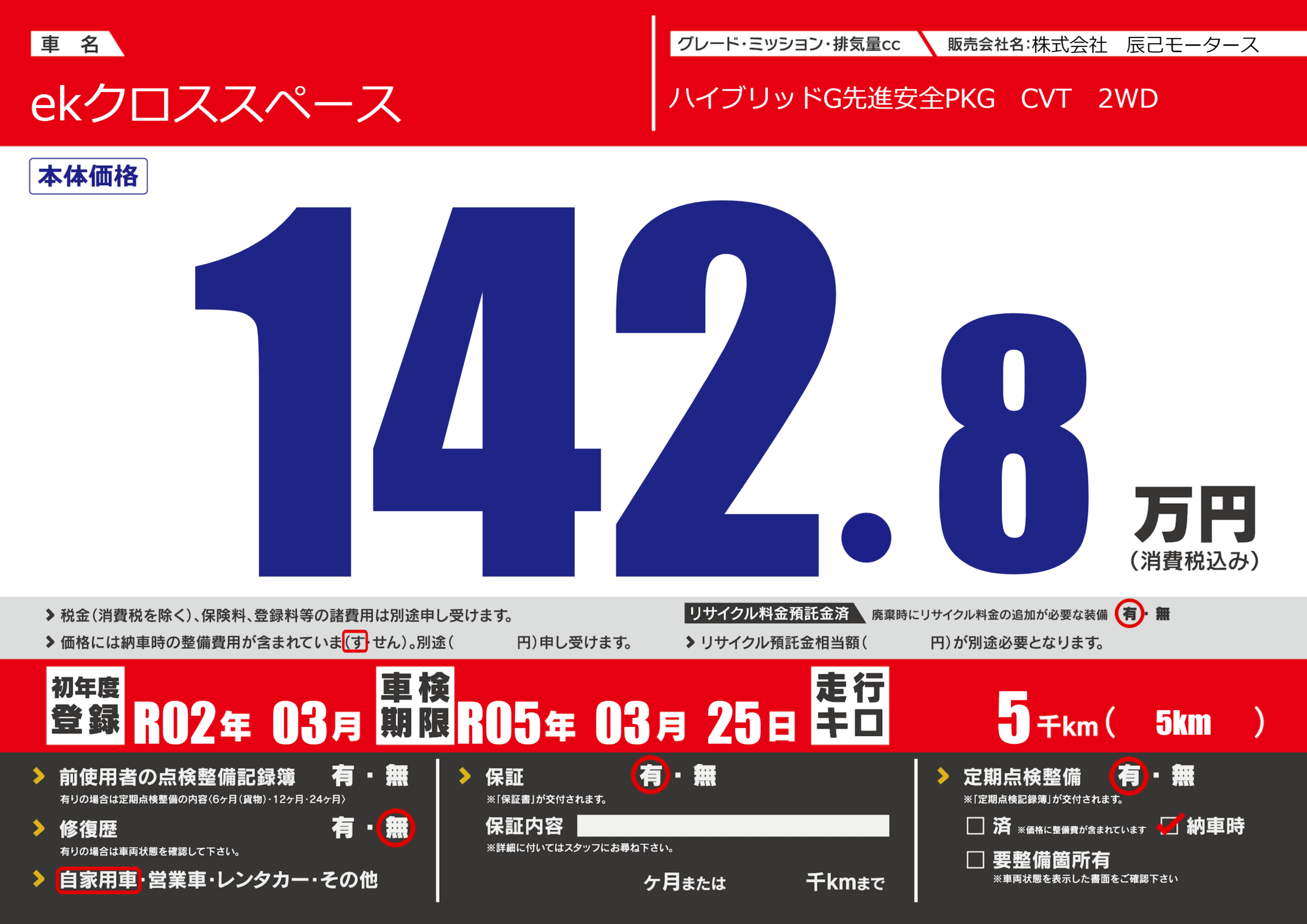 | 走行キロ | 0.5万km | 初年度登録 | R02年03月 |