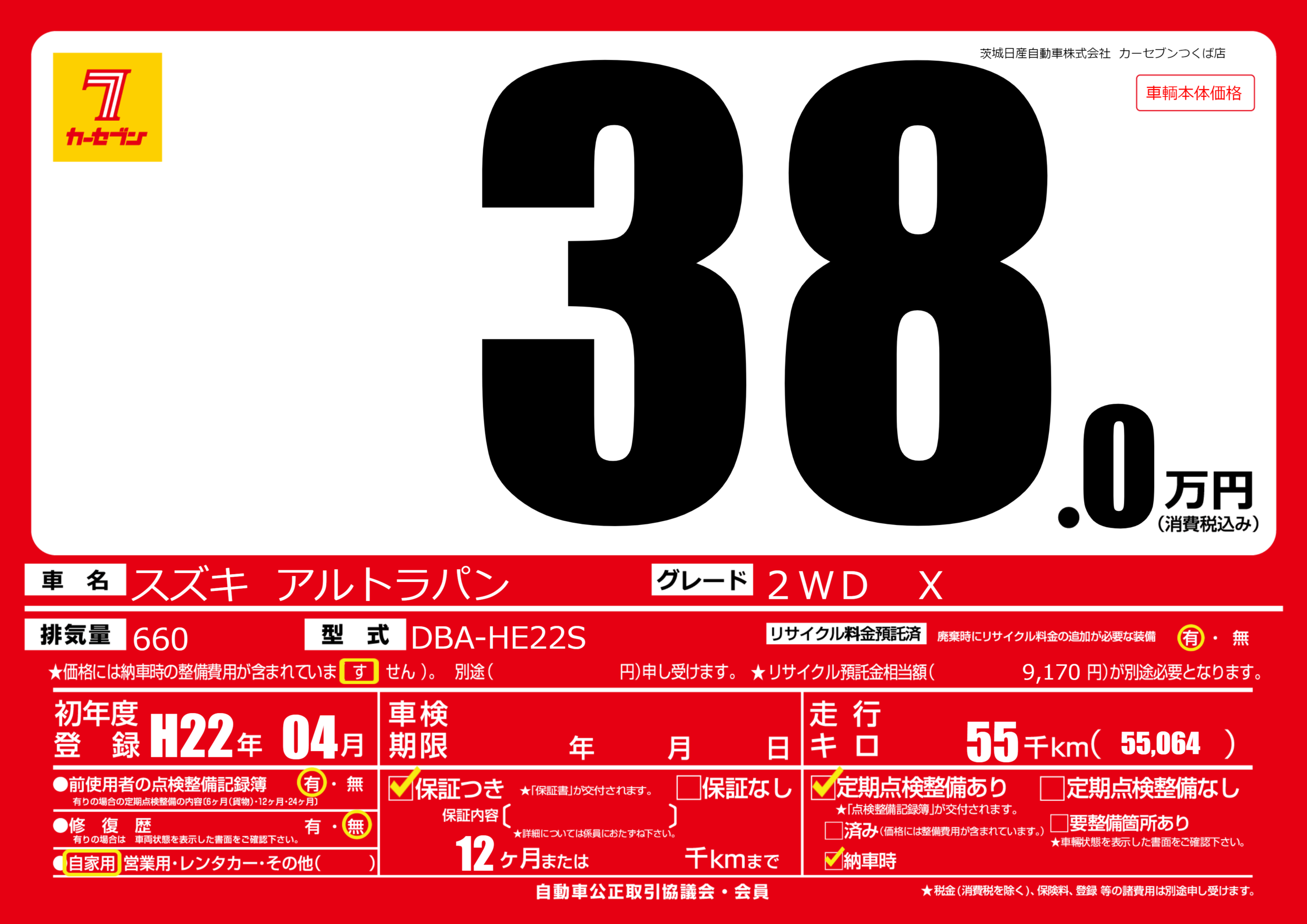保証付き 保証内容(---) 12ヶ月または()千kmまで |