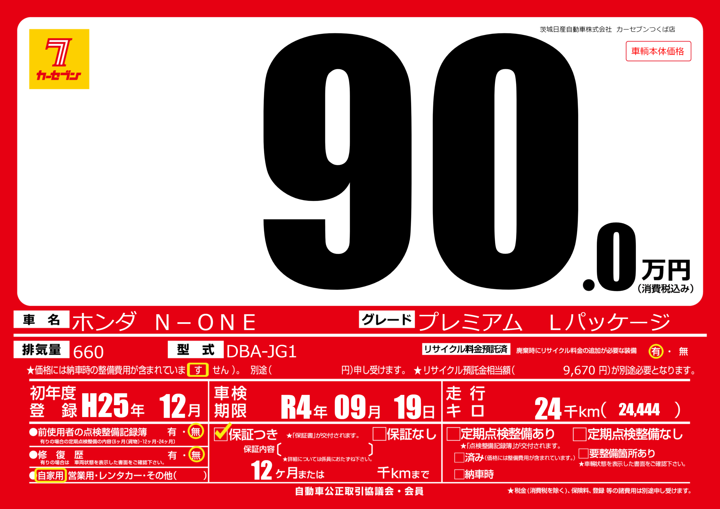 | 車名 | ホンダ N-ONE | グレード ミッション 排気量 |