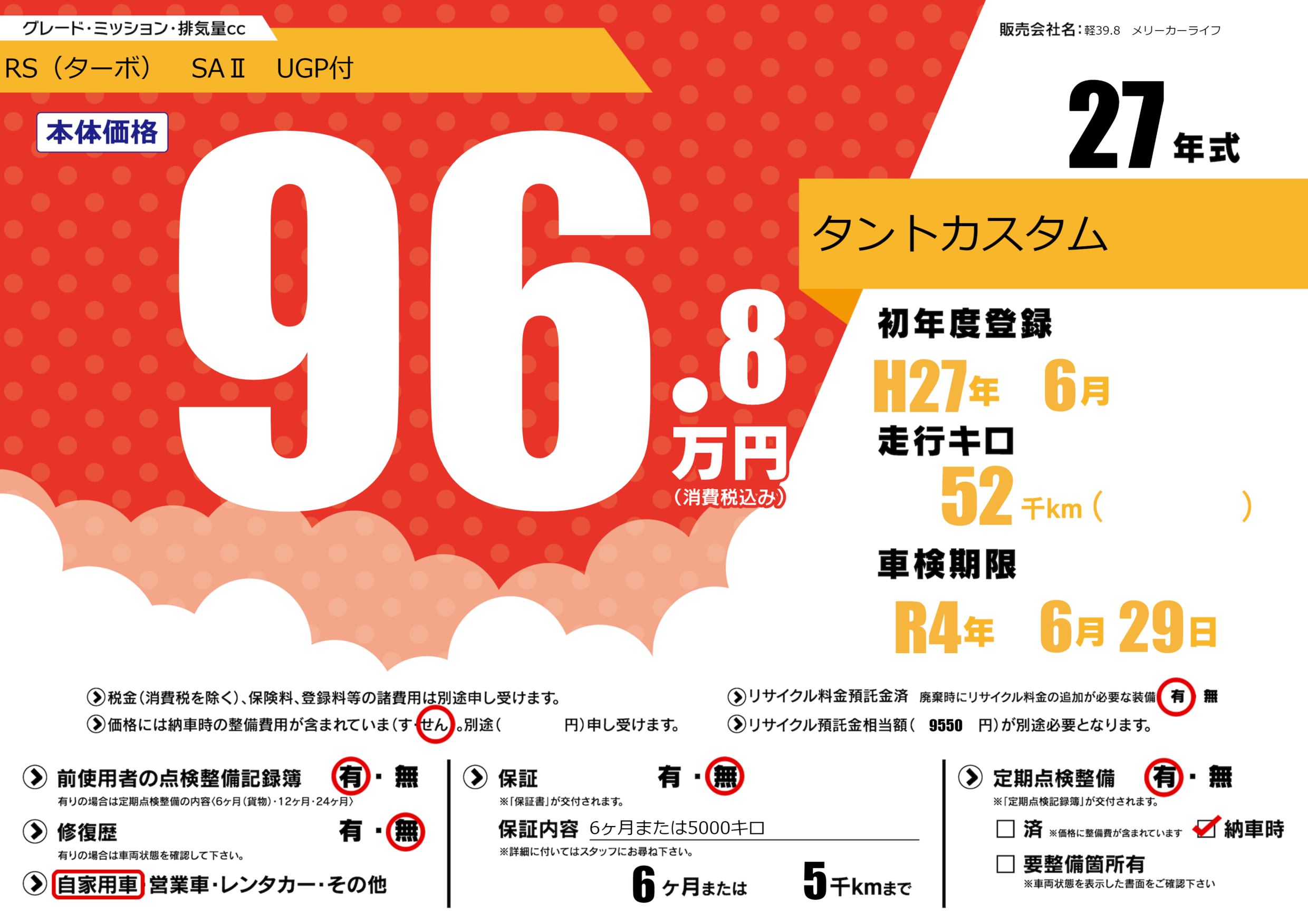 | 車名 | タントカスタム | グレード ミッション 排気量 |