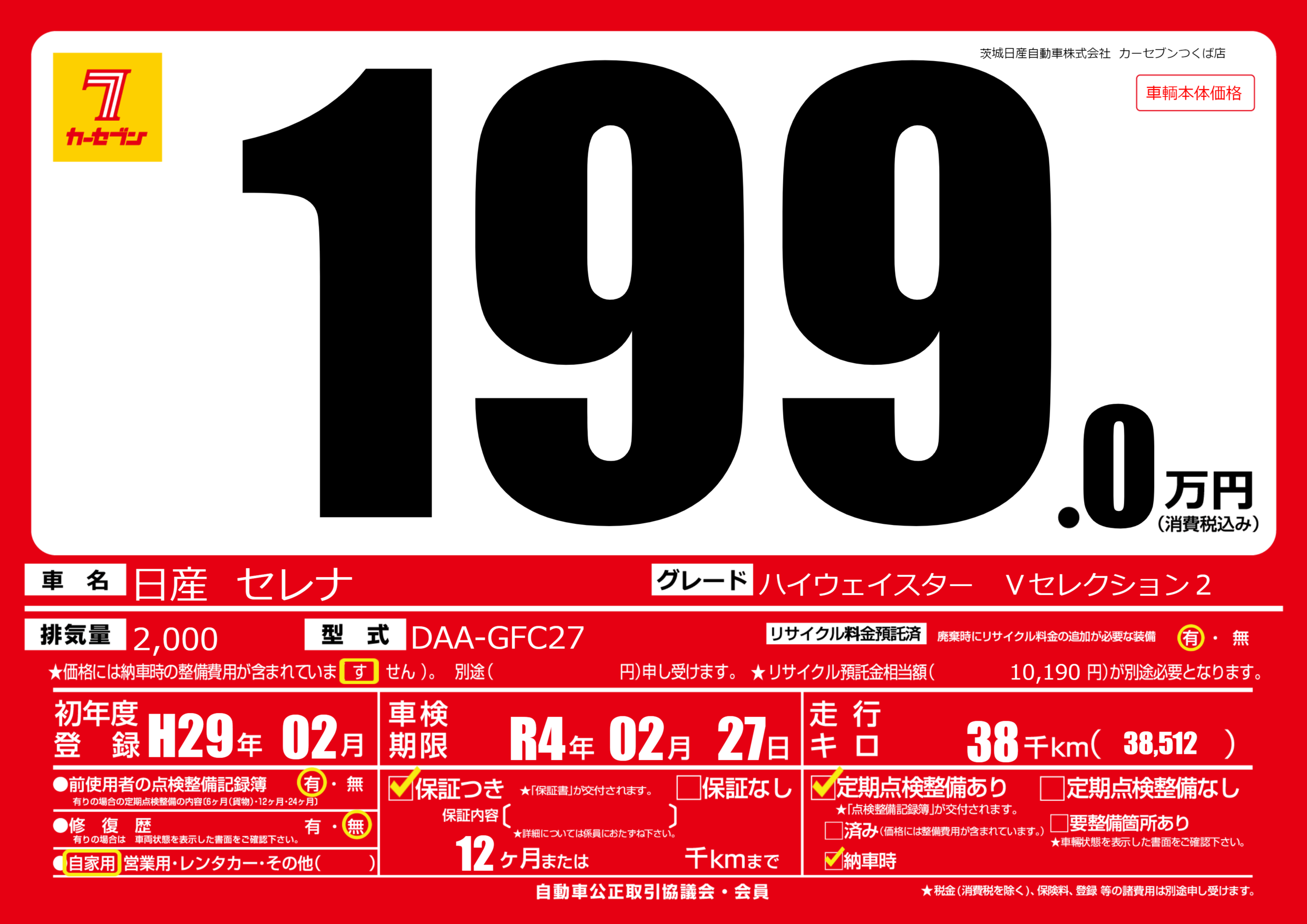 | 車名 | 日産 セレナ | グレード ミッション 排気量 |