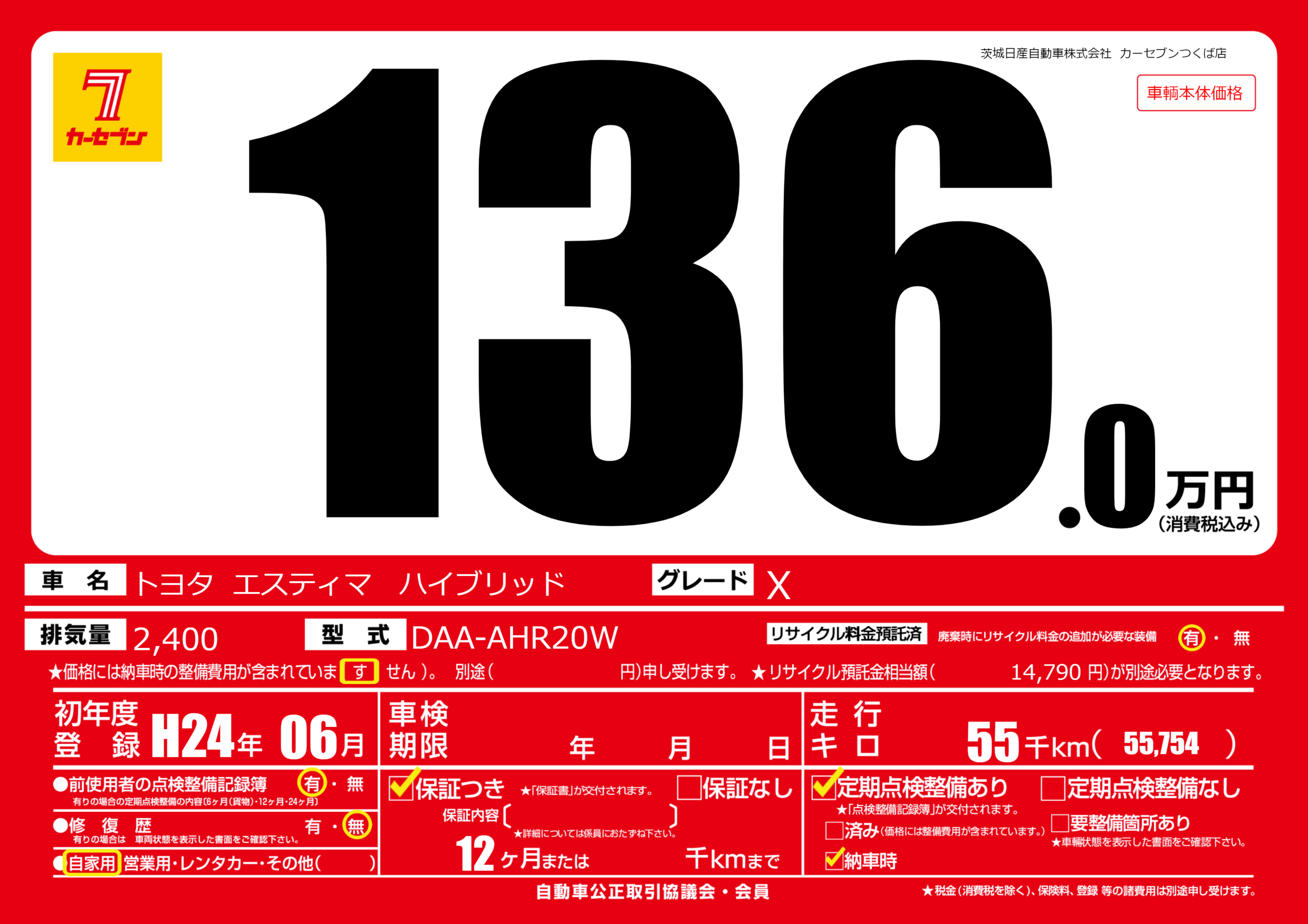 | 車名 | トヨタ エスティマ ハイブリッド | グレード ミッション 排気量 |