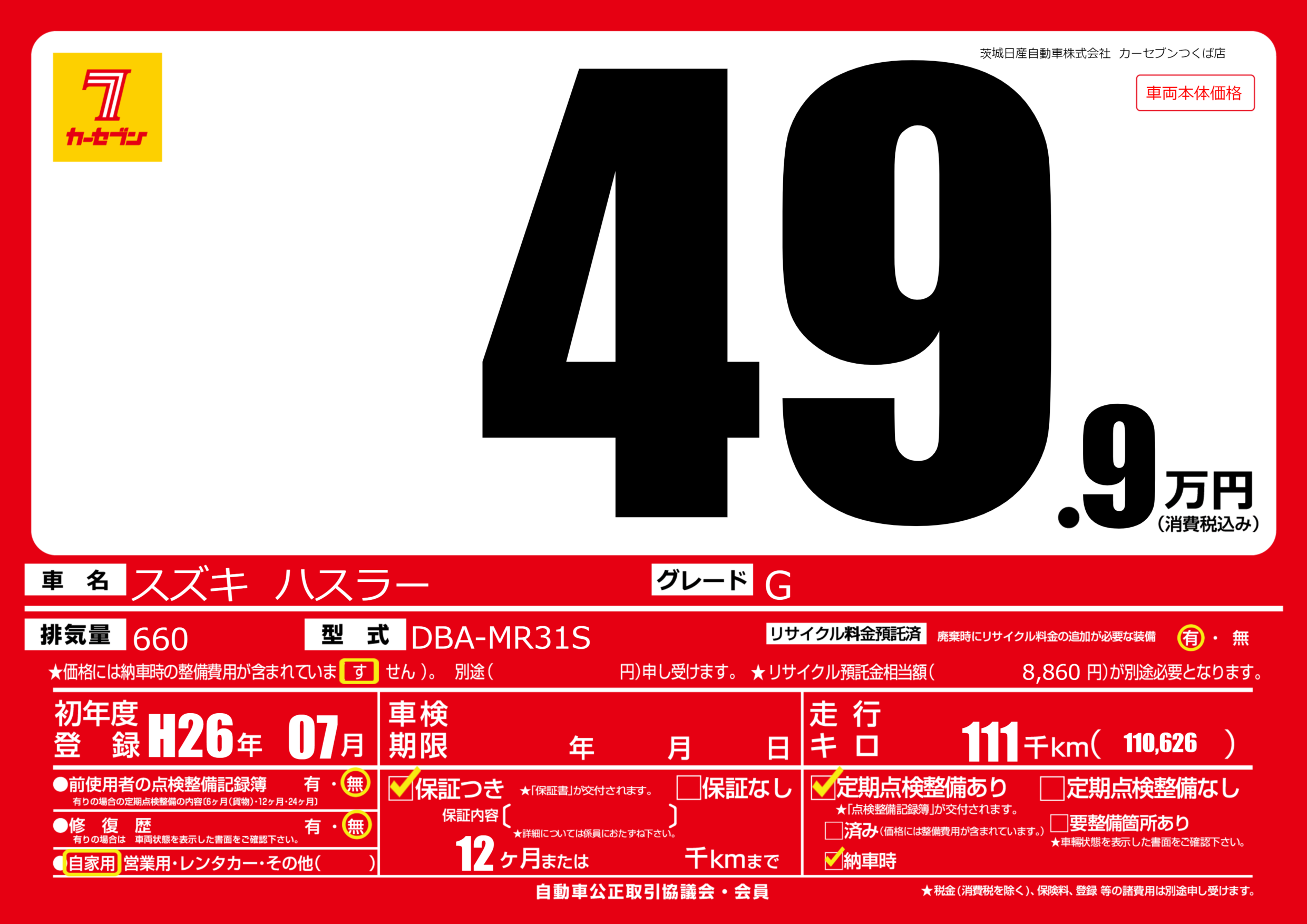 | 車名 | スズキ ハスラー | グレード ミッション 排気量 |