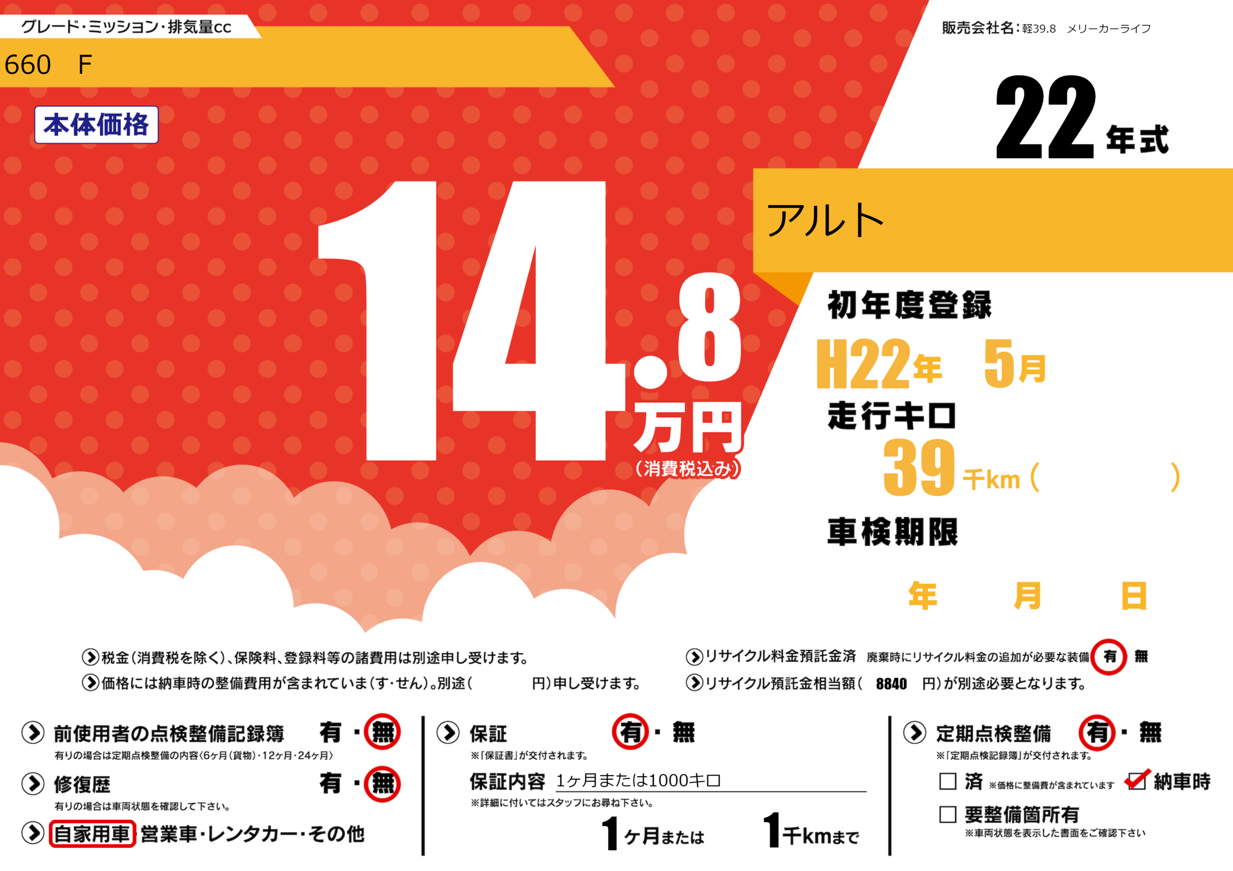 保証内容(1ヶ月または1000キロ) 1ヶ月または1千km