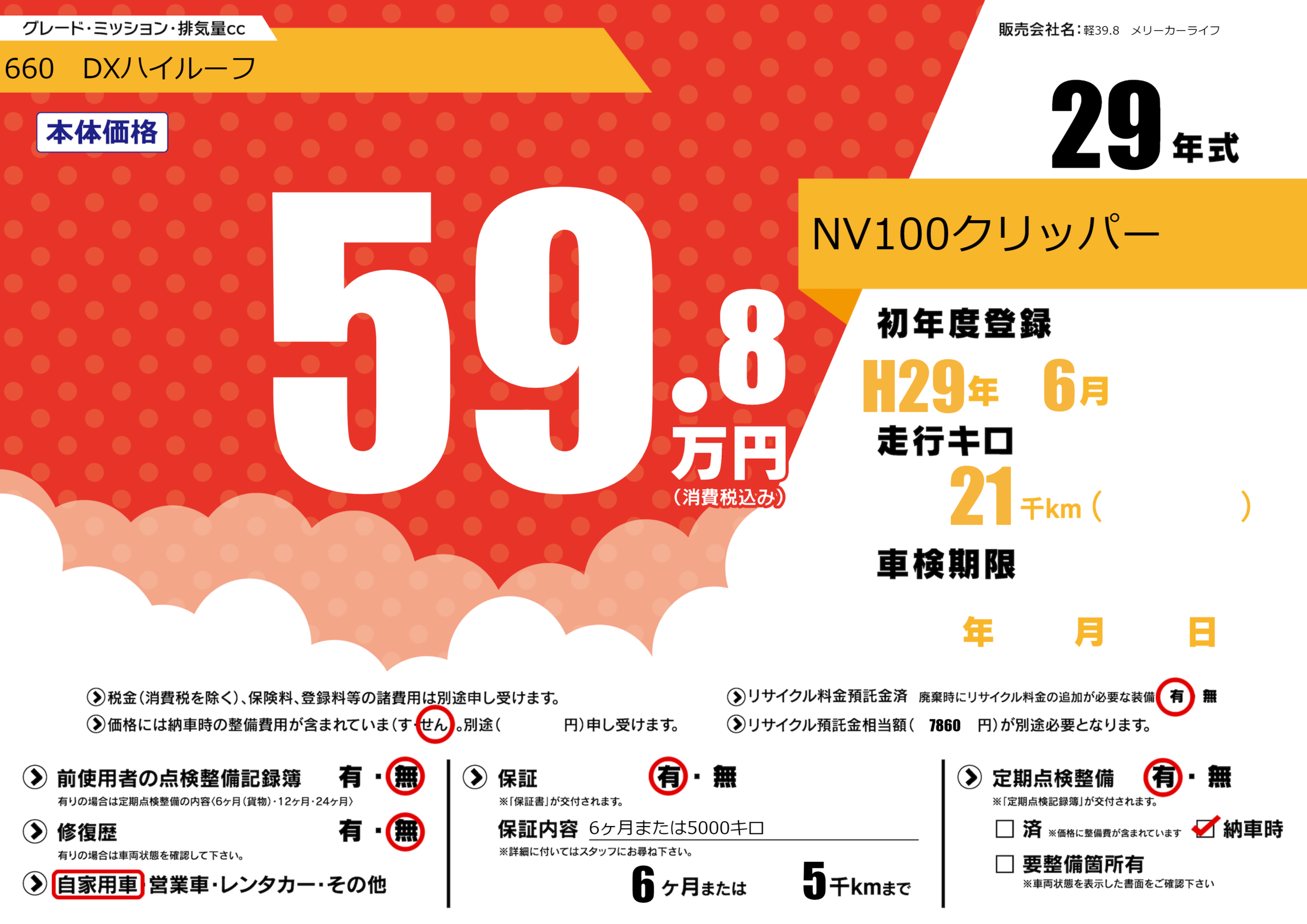 | 定期点検整備 | 定期点検整備あり 納車時あり | ||