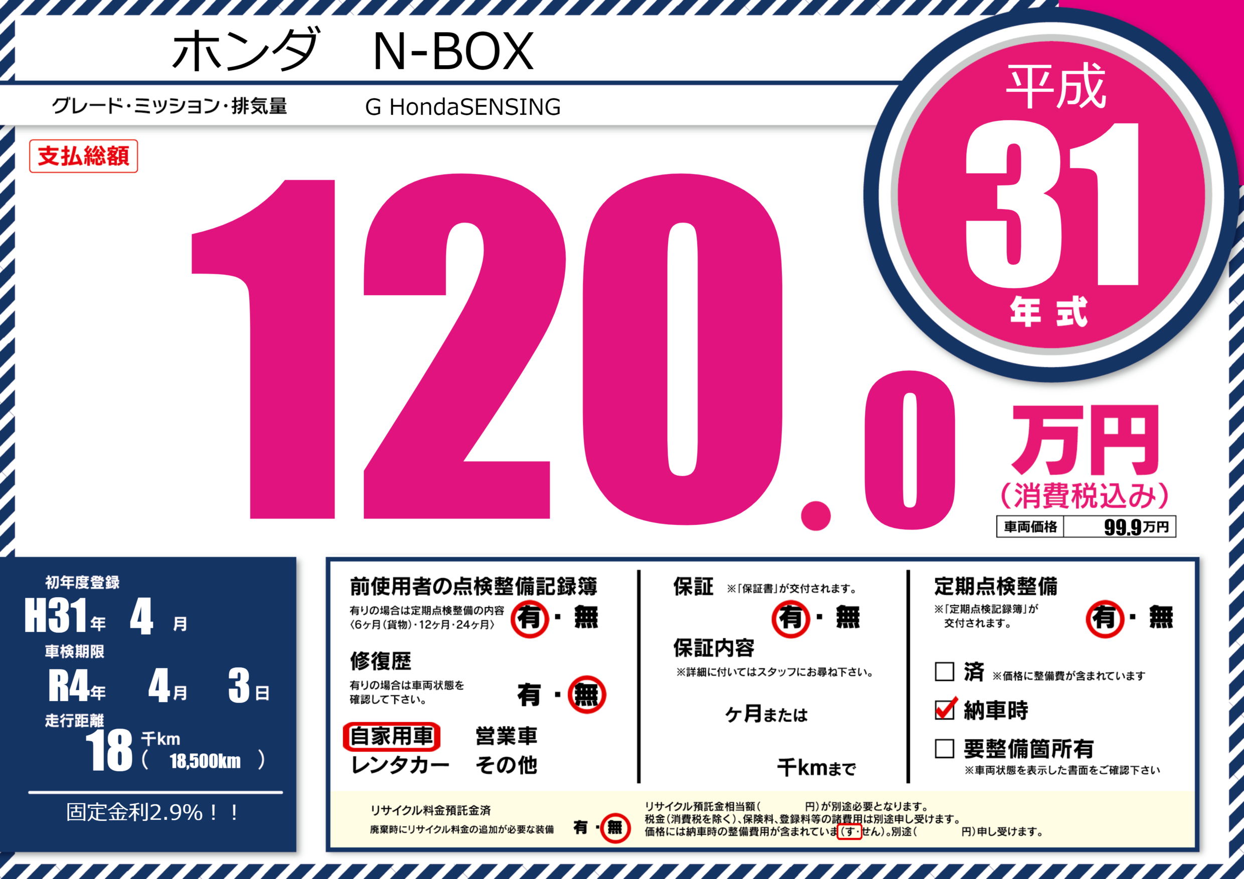 | 走行キロ | 1.8万km | 初年度登録 | H31年4月 |