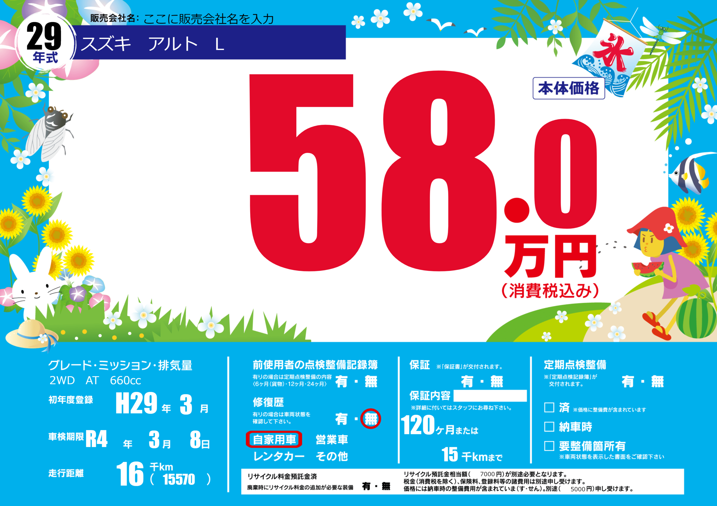 | 車名 | スズキ アルト L | グレード ミッション 排気量 |