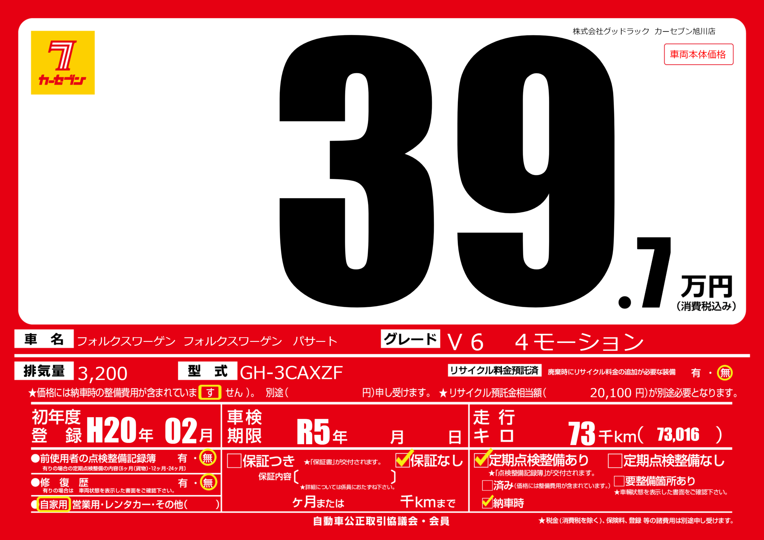| 車名 | フォルクスワーゲン フォルクスワーゲン パサート | グレード ミッション 排気量 |
