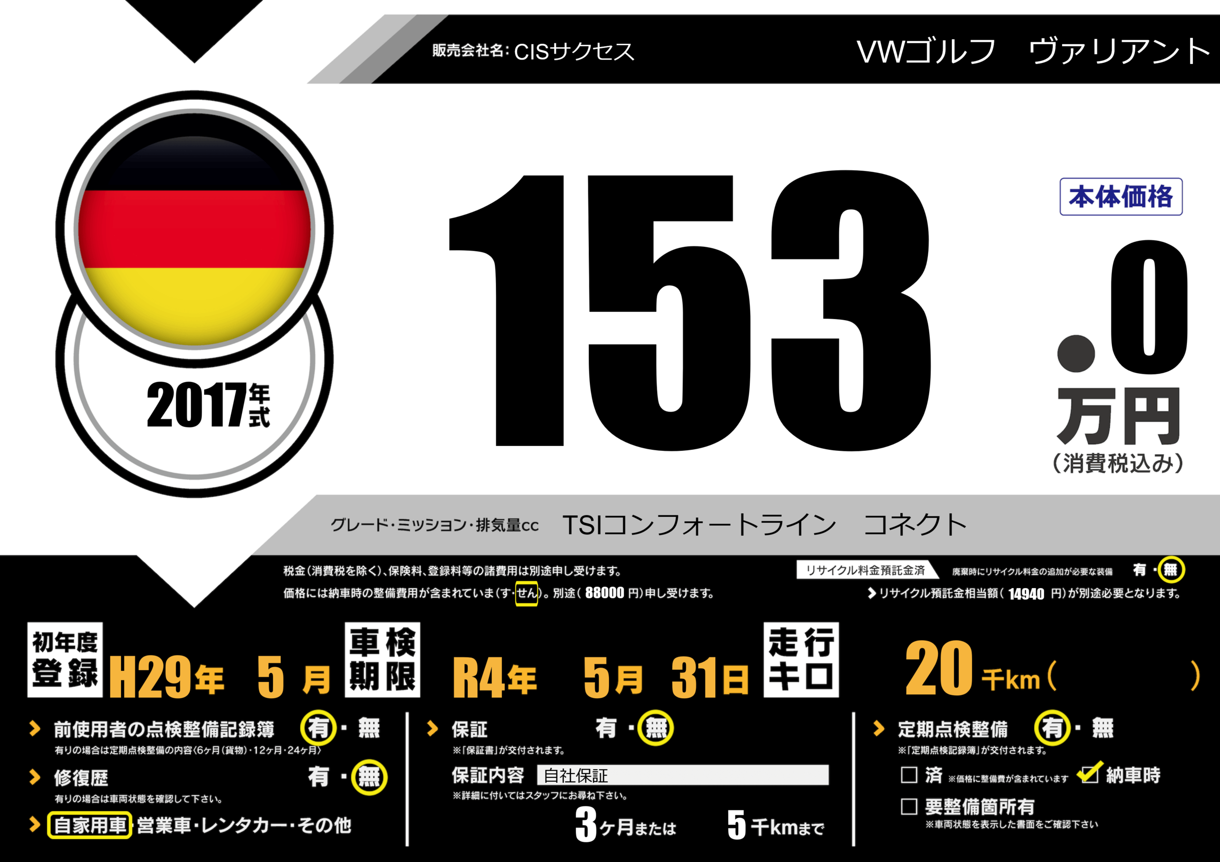 | 車名 | VWゴルフ ヴァリアント | グレード ミッション 排気量 |