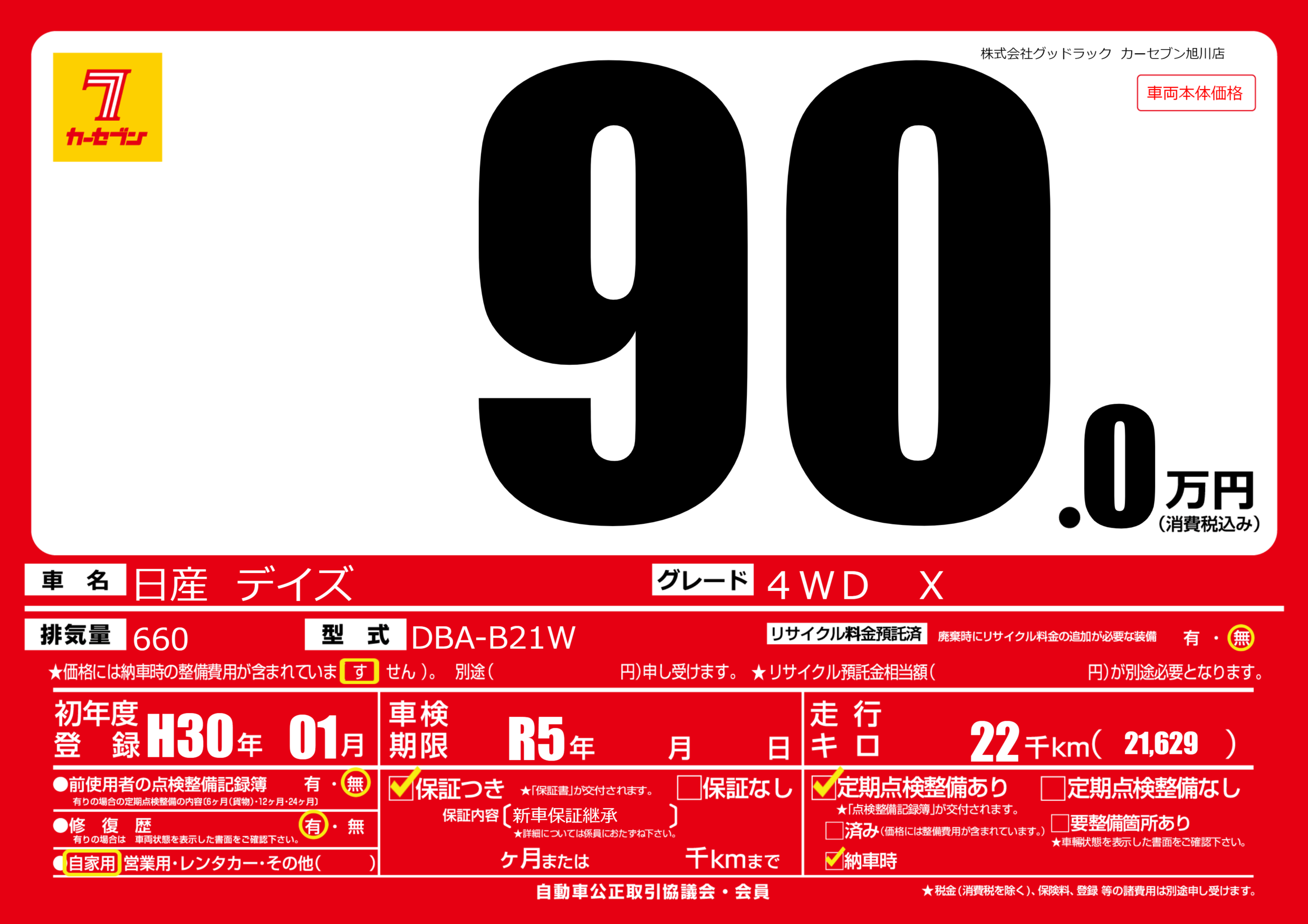 | 車名 | 日産 デイズ | グレード ミッション 排気量 |