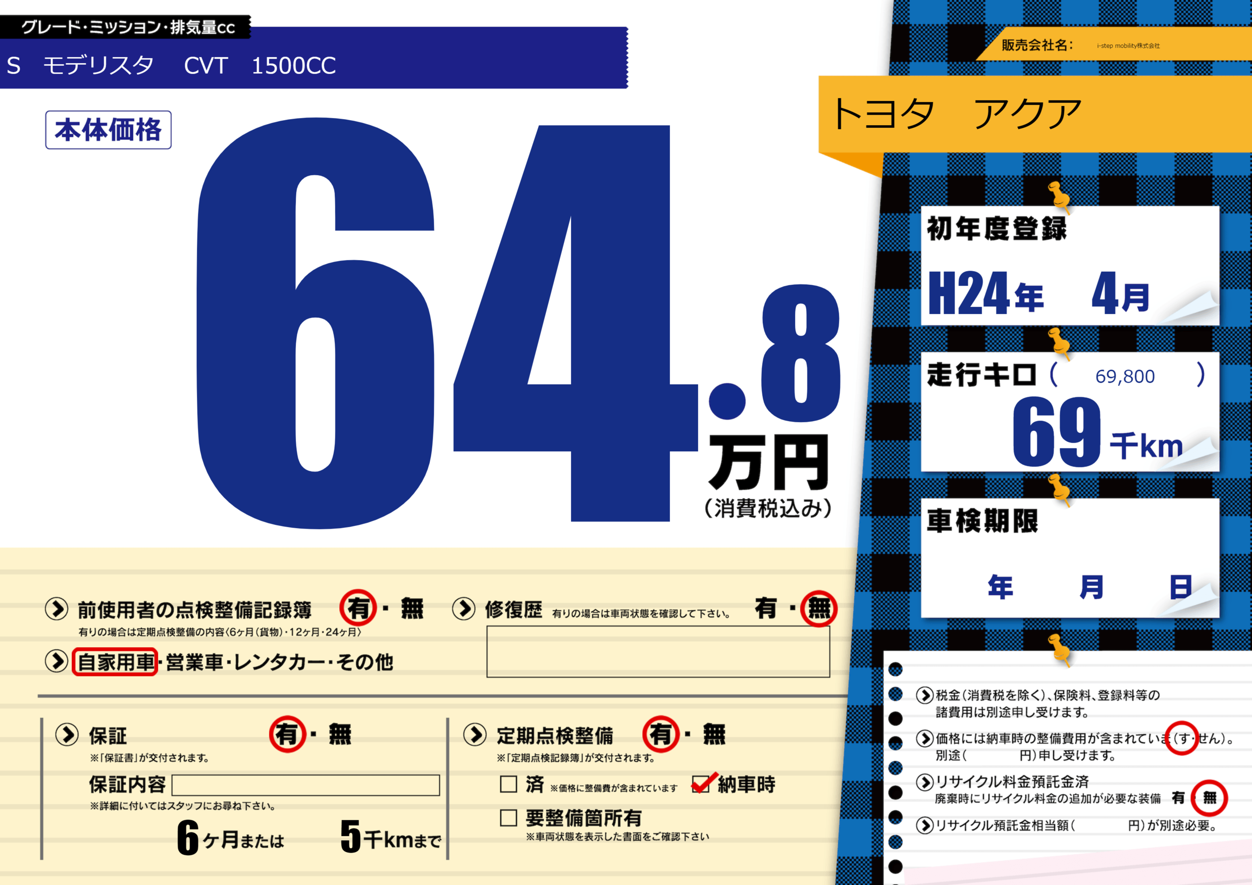 | 定期点検整備 | 定期点検整備あり 納車時あり | ||
