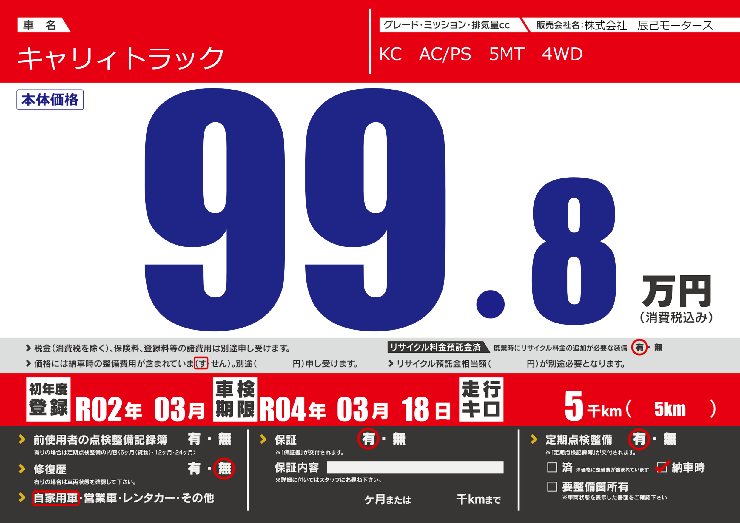 | 定期点検整備 | 定期点検整備あり 納車時あり | ||
