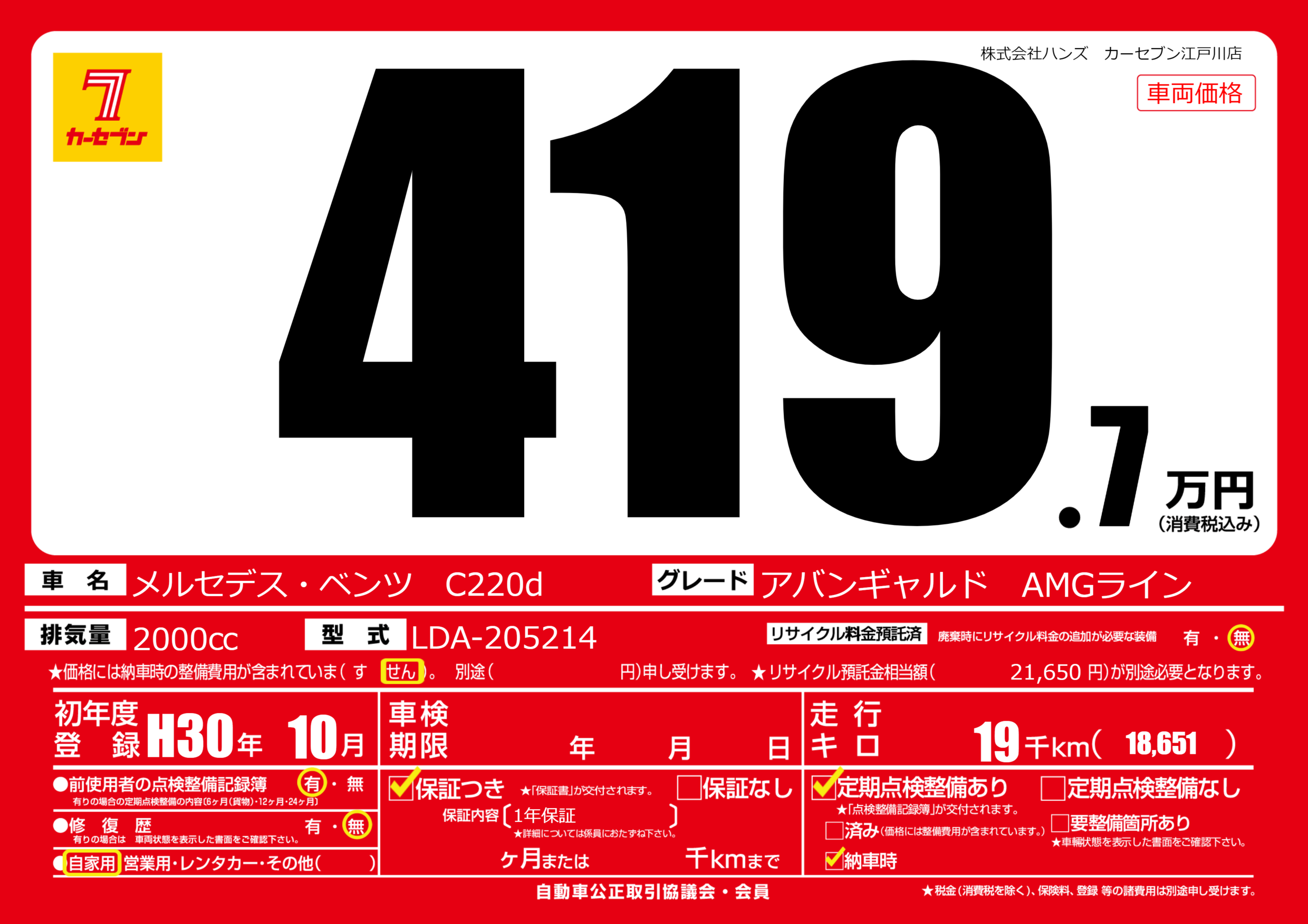 | 車名 | メルセデス・ベンツ C220d | グレード ミッション 排気量 |