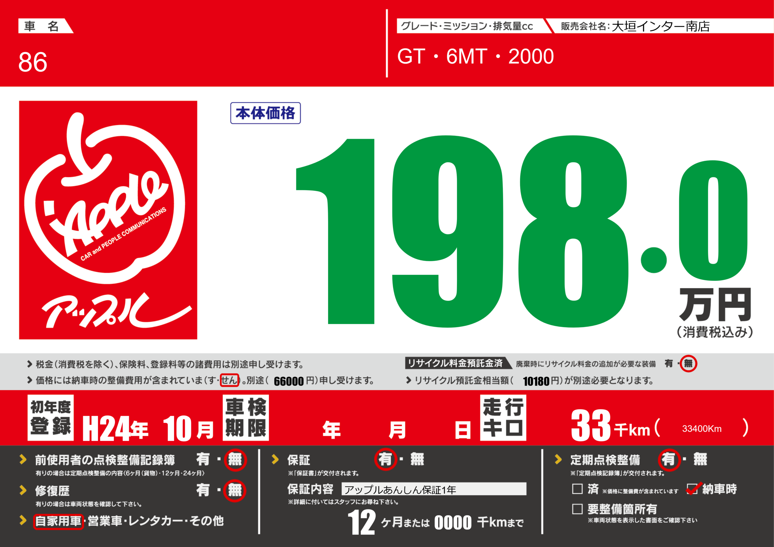 | 走行キロ | 3.3万km | 初年度登録 | H24年10月 |