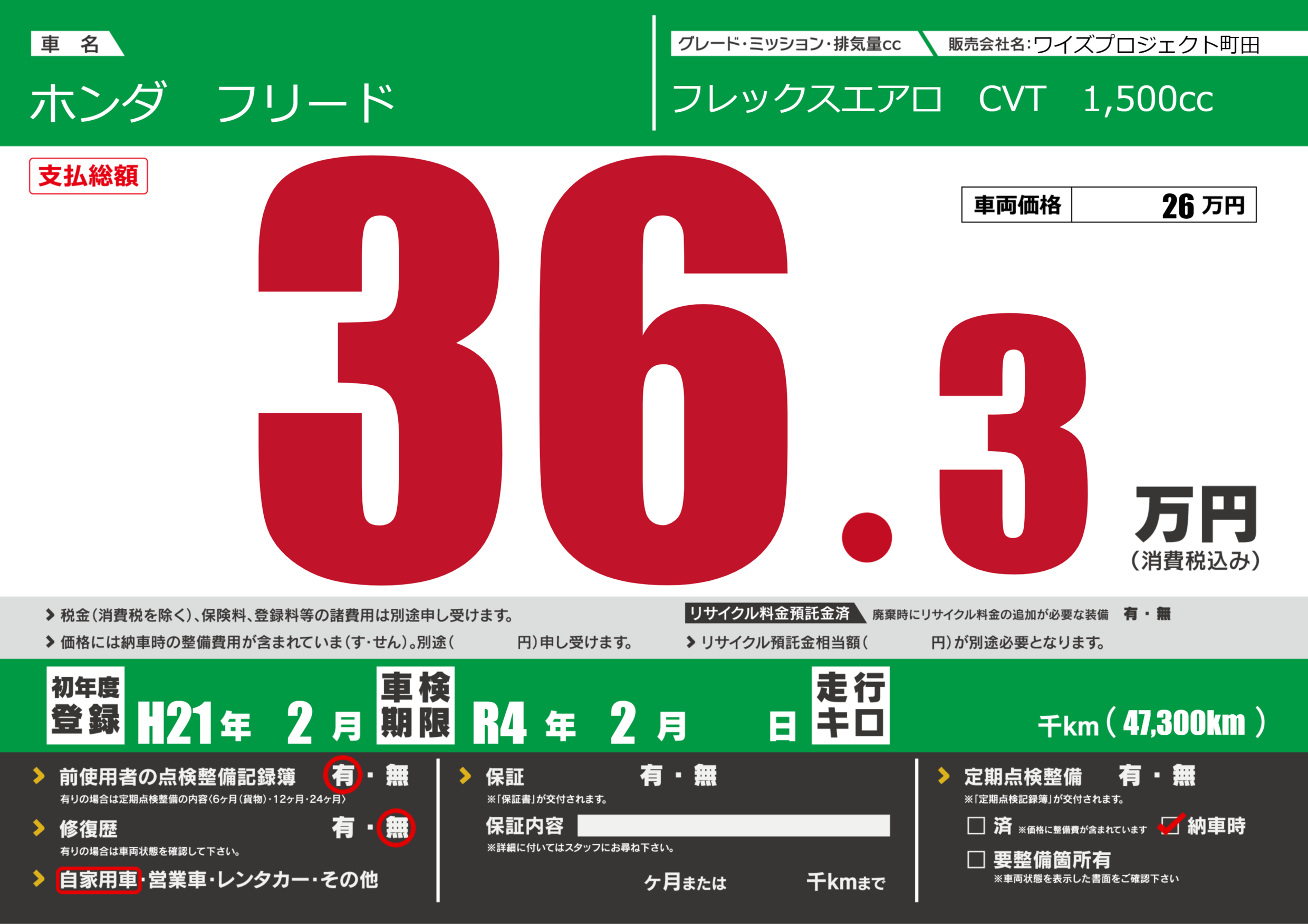 | 車名 | ホンダ フリード | グレード ミッション 排気量 |