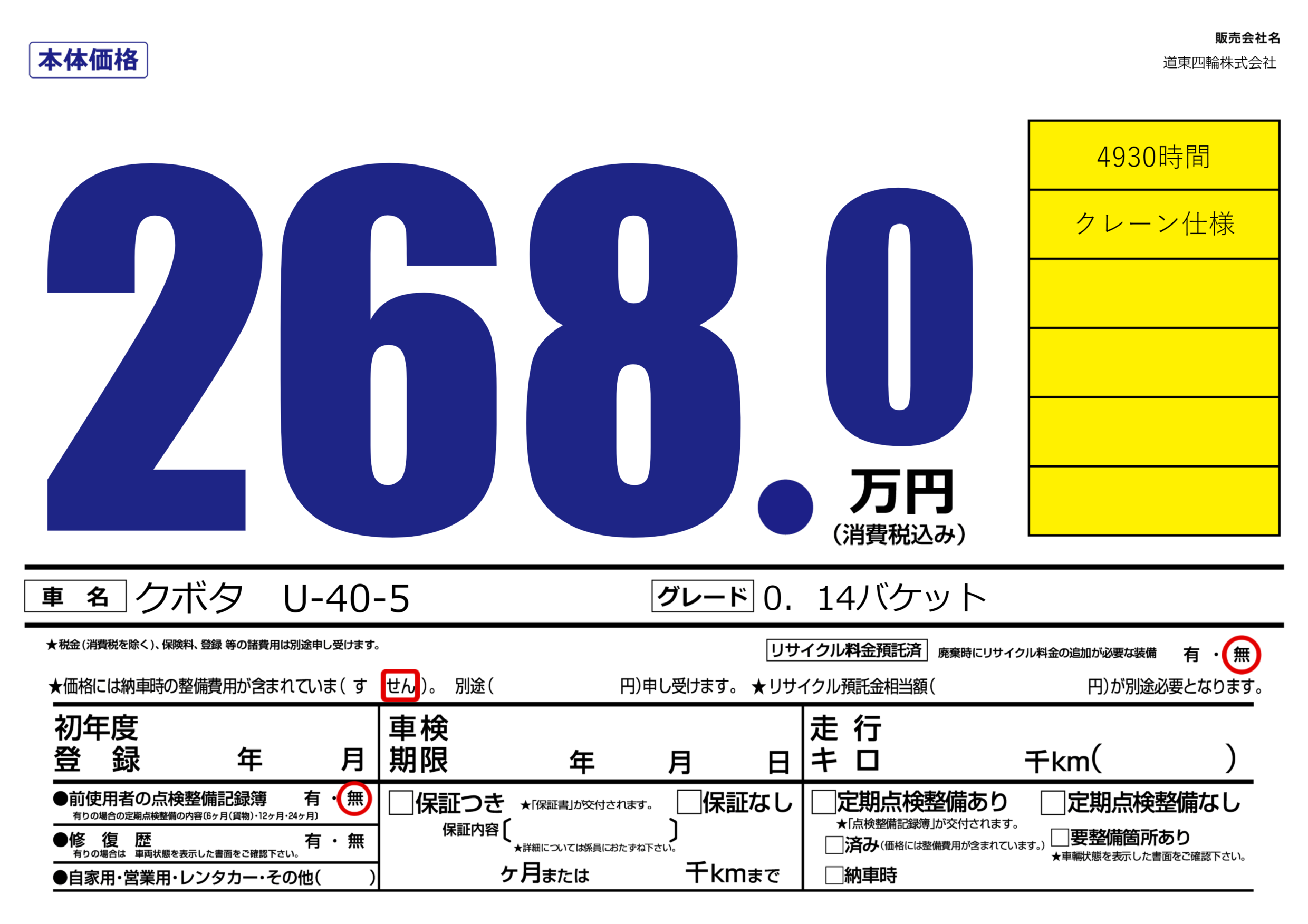 | 車名 | クボタ U-40-5 | グレード ミッション 排気量 |