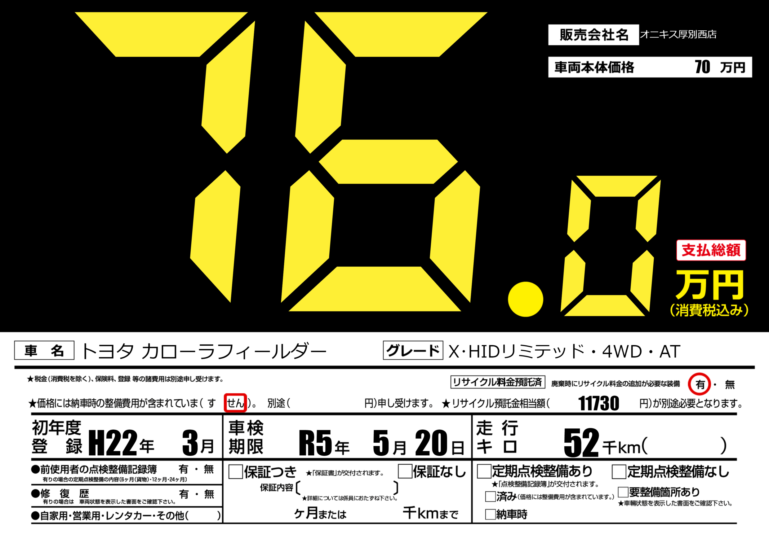 | 走行キロ | 5.2万km | 初年度登録 | H22年3月 |