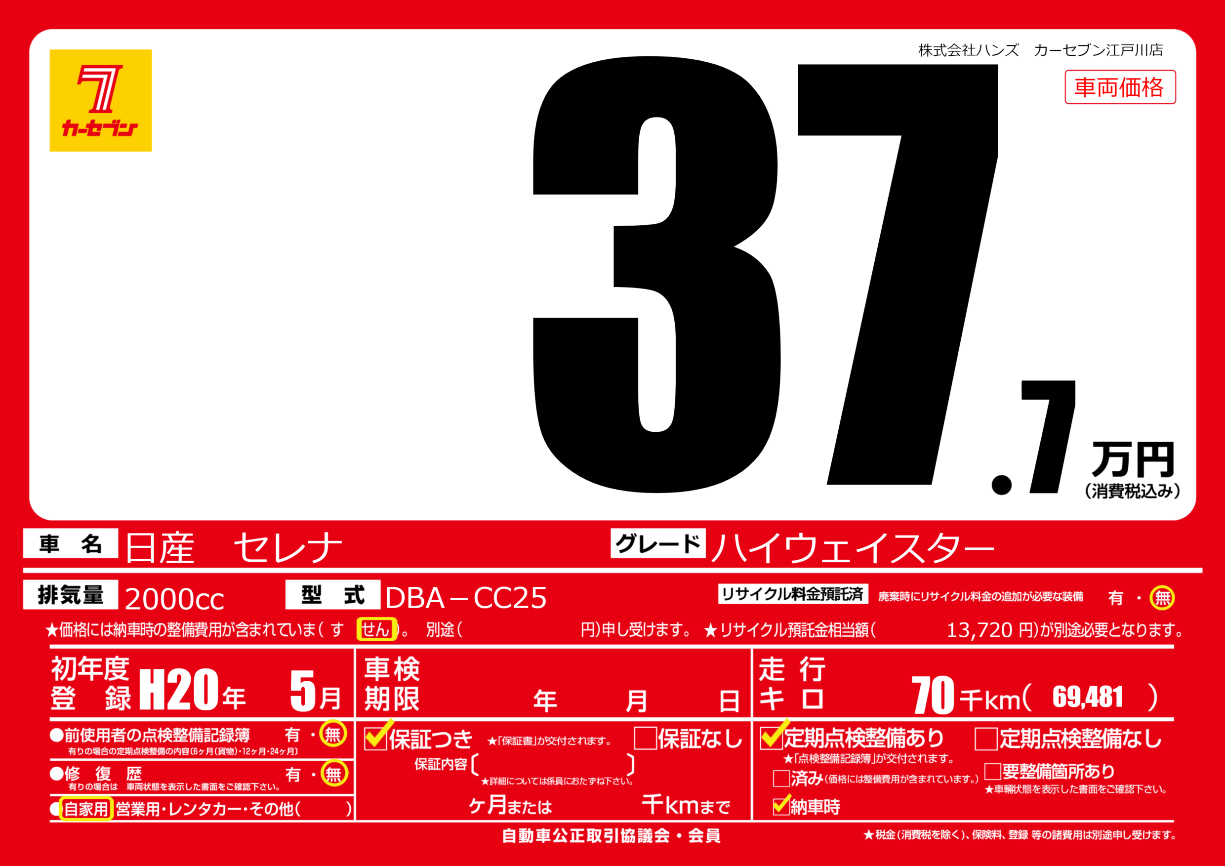 | 走行キロ | 7万km | 初年度登録 | H20年5月 |