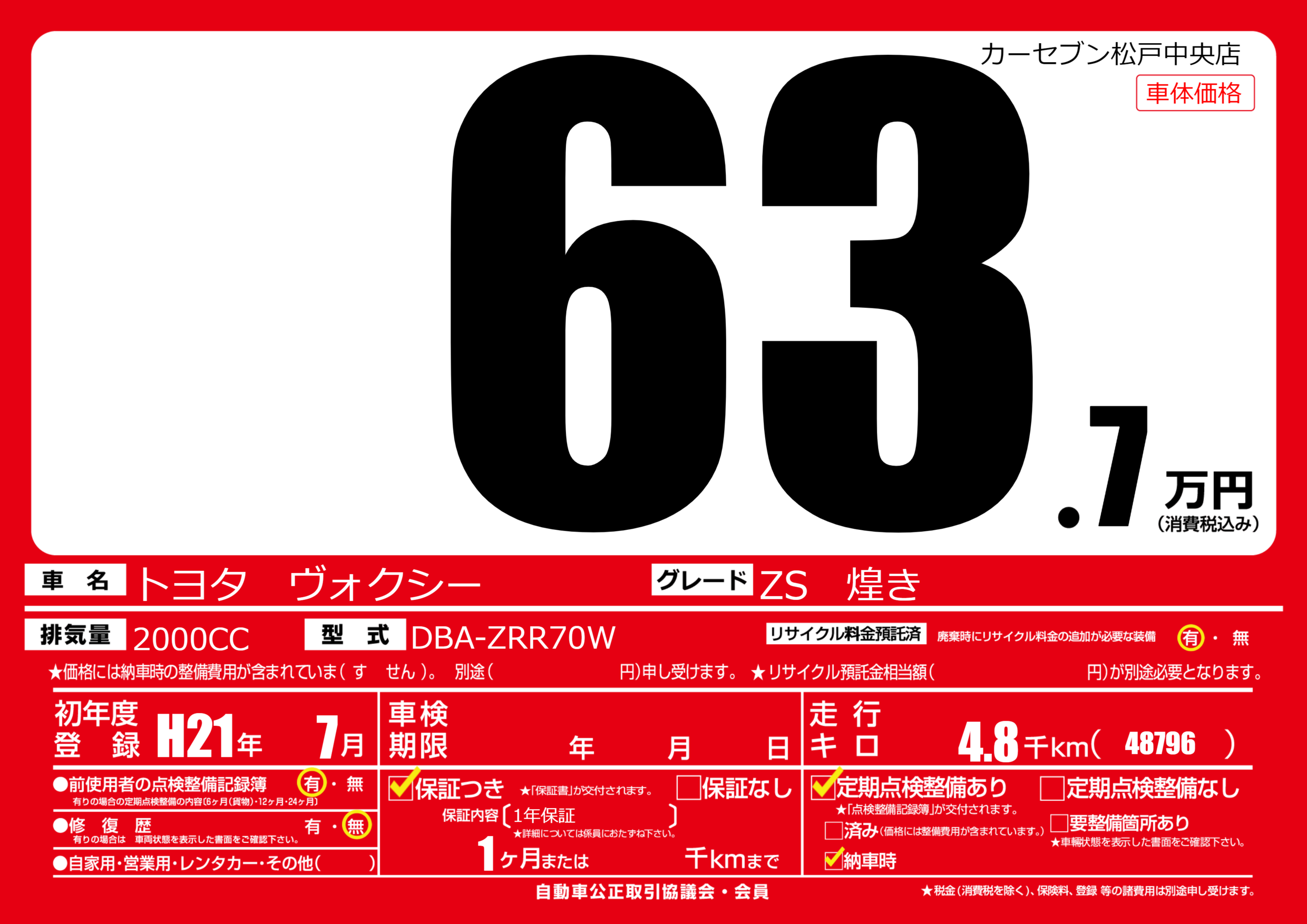 保証付き 保証内容(1年保証) 1ヶ月または()千kmまで |