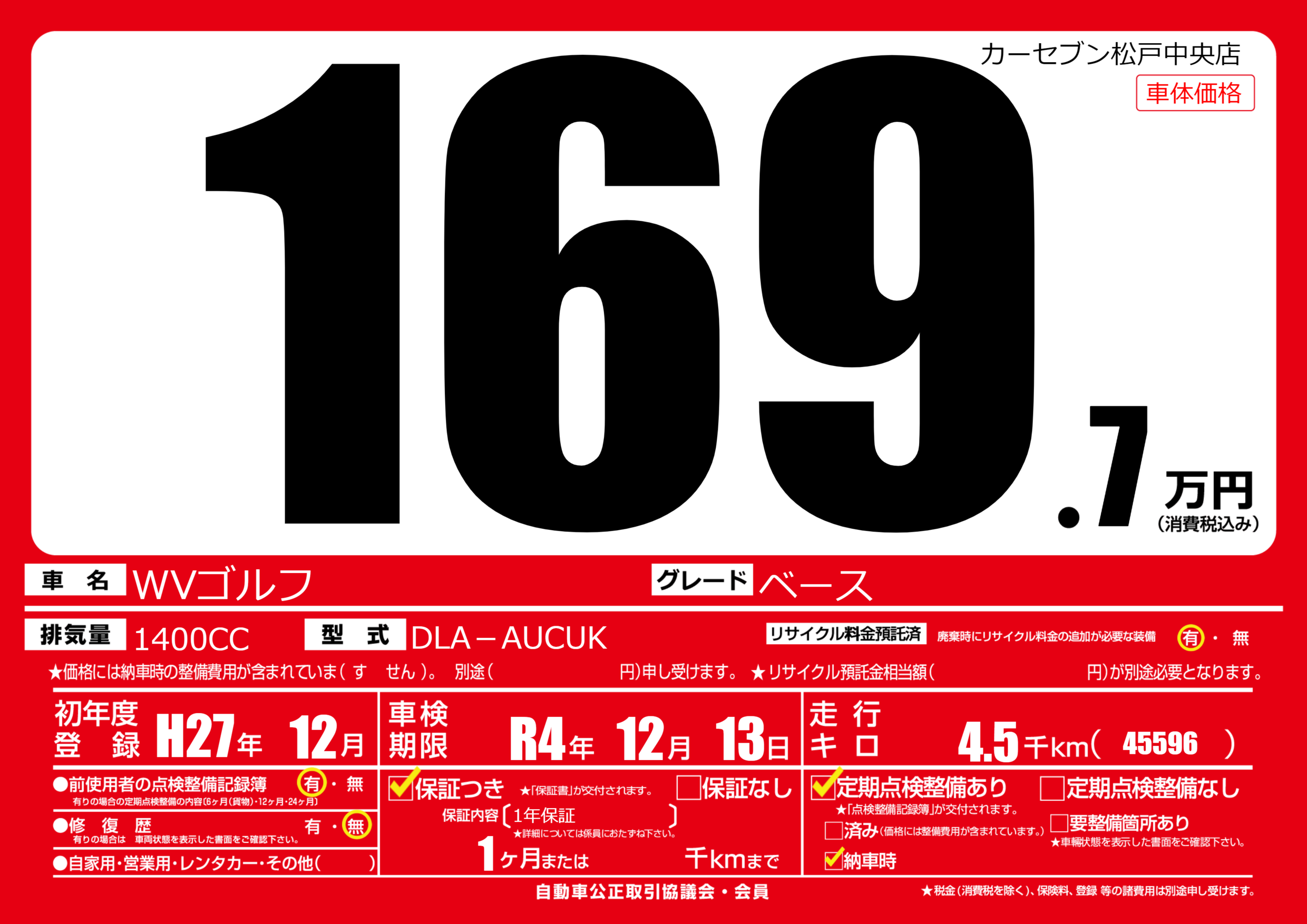 | 車名 | WVゴルフ | グレード ミッション 排気量 |