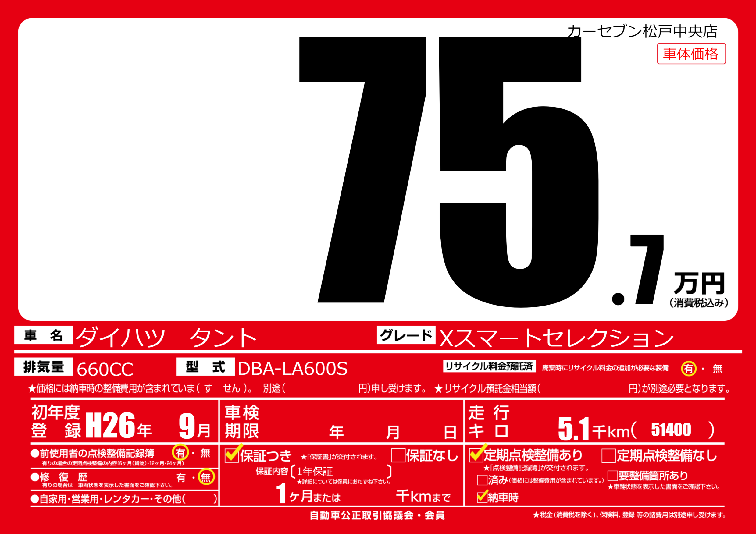 | 車名 | ダイハツ タント | グレード ミッション 排気量 |