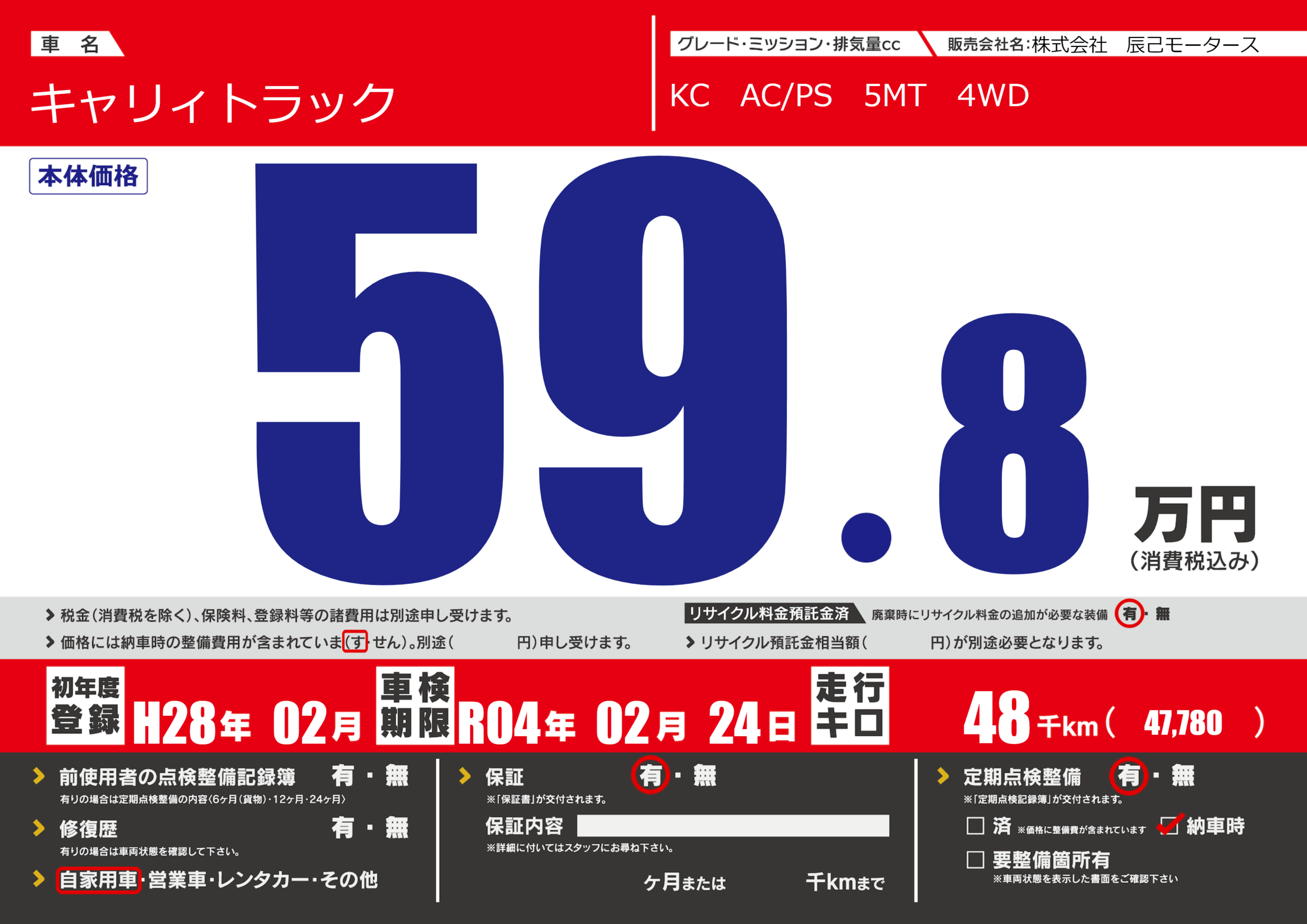 | 車名 | キャリィトラック | グレード ミッション 排気量 |