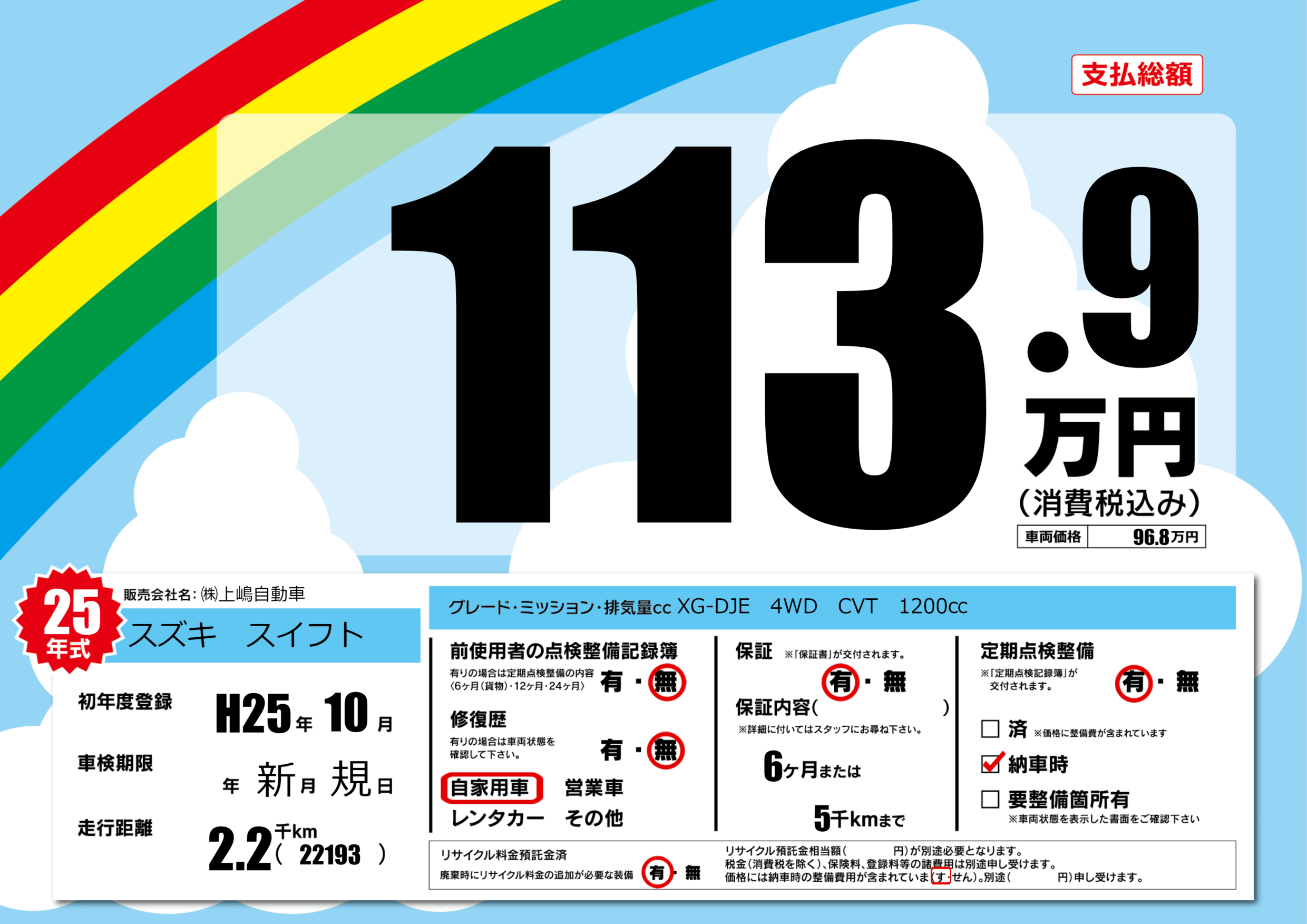 | 走行キロ | 0.2万km | 初年度登録 | H25年10月 |