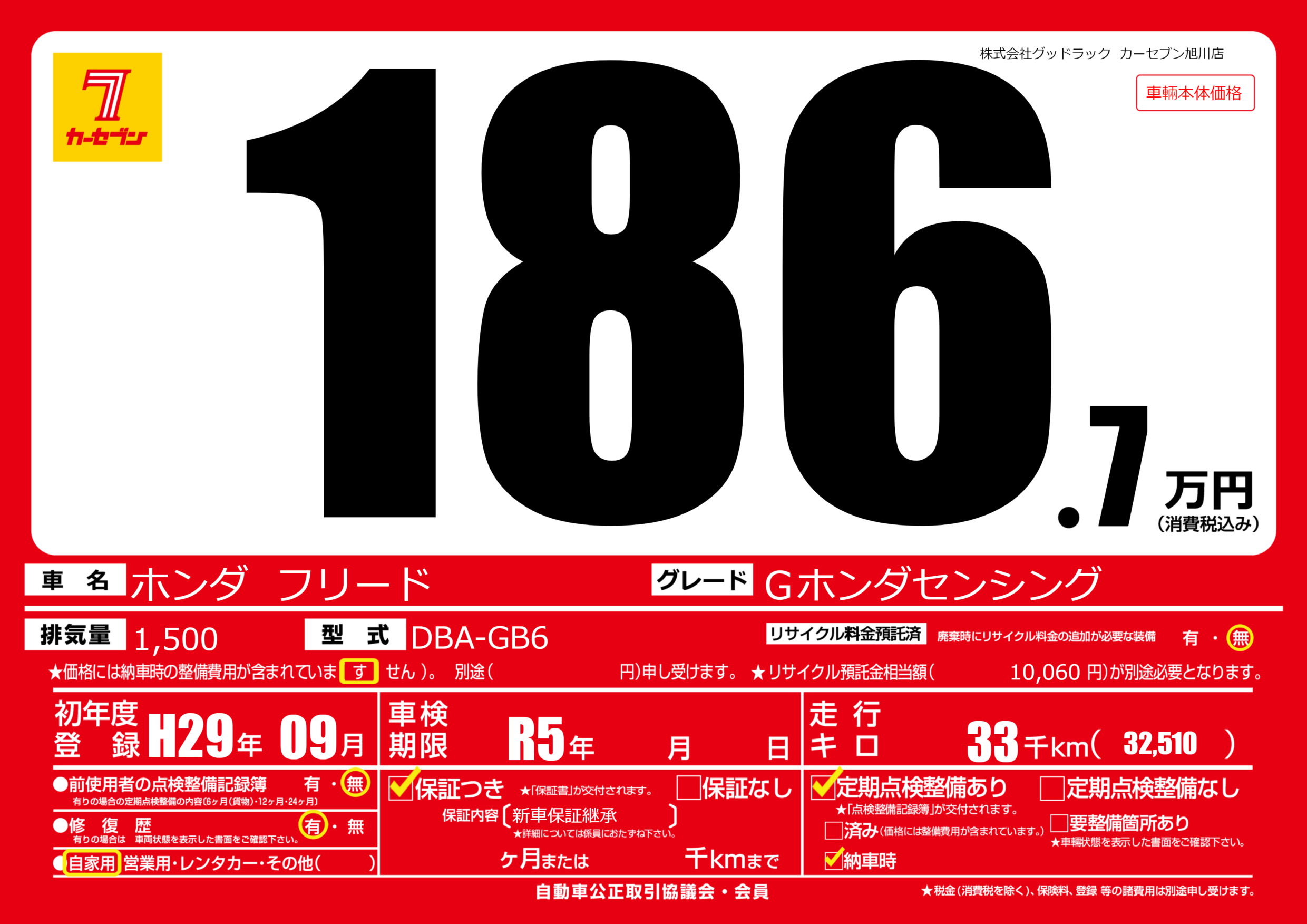 | 車名 | ホンダ フリード | グレード ミッション 排気量 |