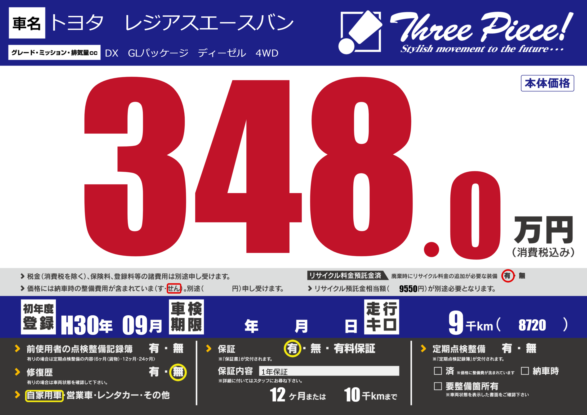 | 走行キロ | 0.9万km | 初年度登録 | H30年09月 |
