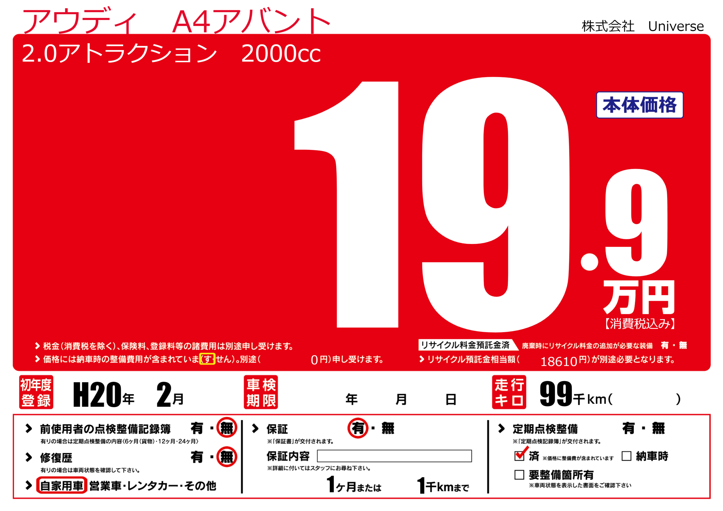 | 車名 | アウディ A4アバント | グレード ミッション 排気量 |