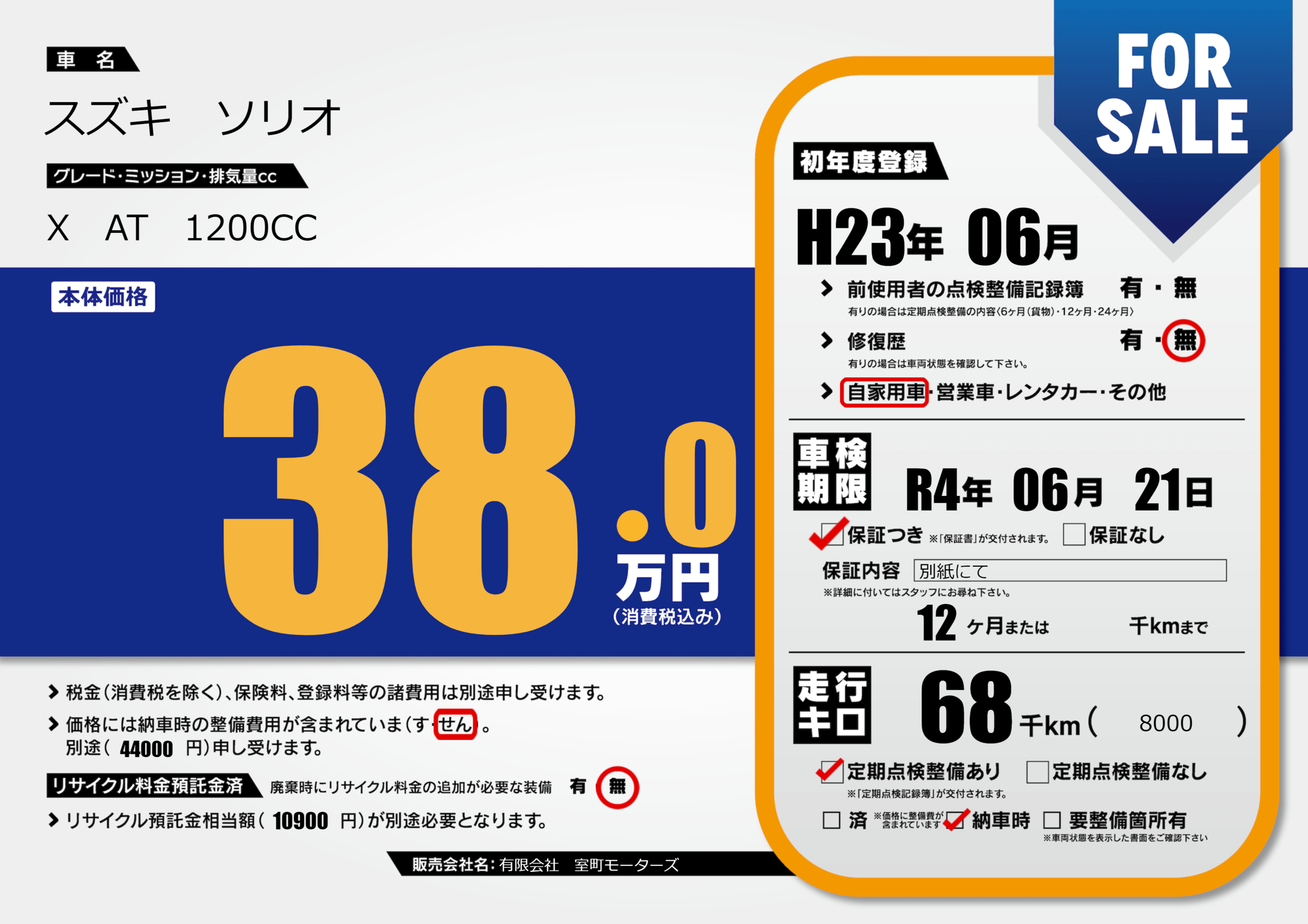 | 車名 | スズキ ソリオ | グレード ミッション 排気量 |