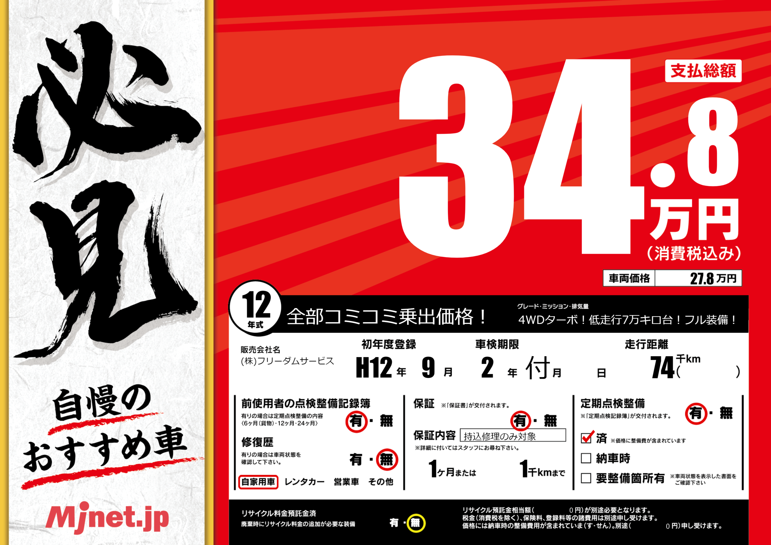 | 走行キロ | 7.4万km | 初年度登録 | H12年9月 |
