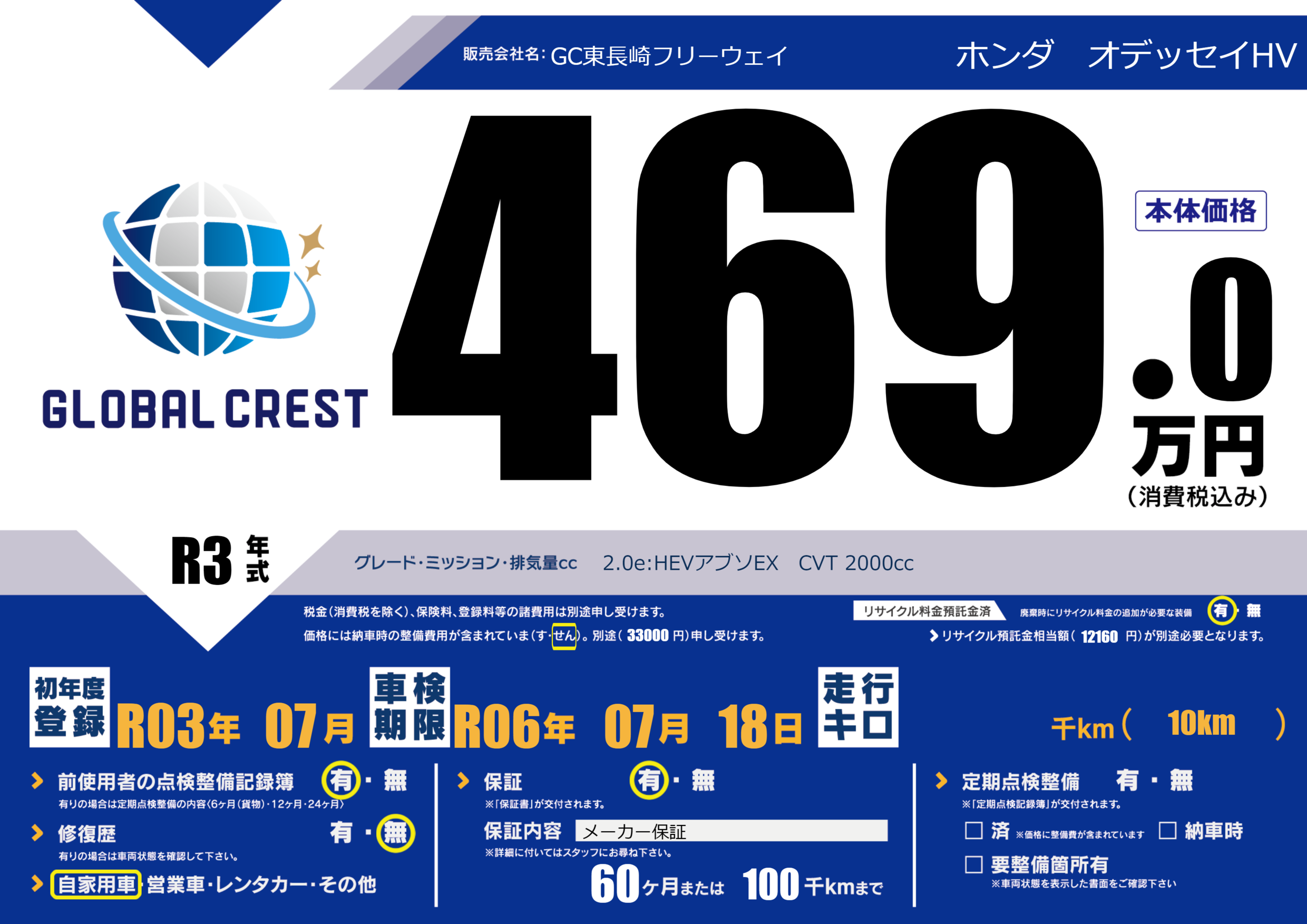 | 車名 | ホンダ オデッセイHV | グレード ミッション 排気量 |