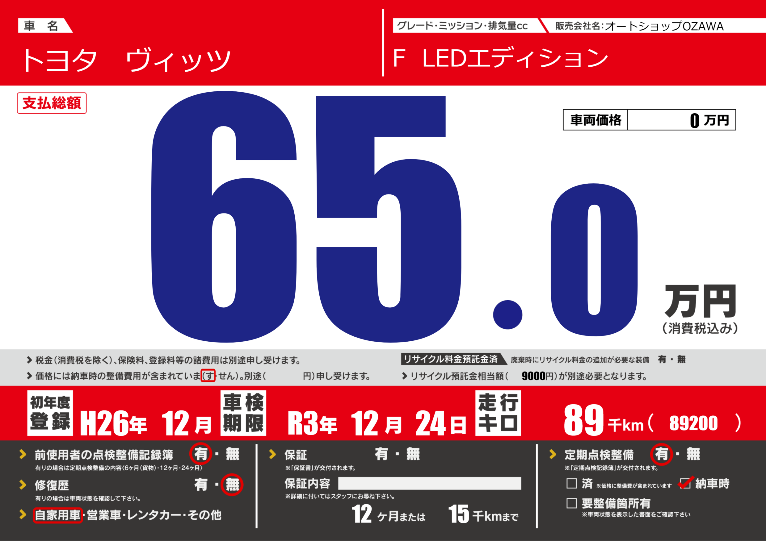 | 走行キロ | 8.9万km | 初年度登録 | H26年12月 |