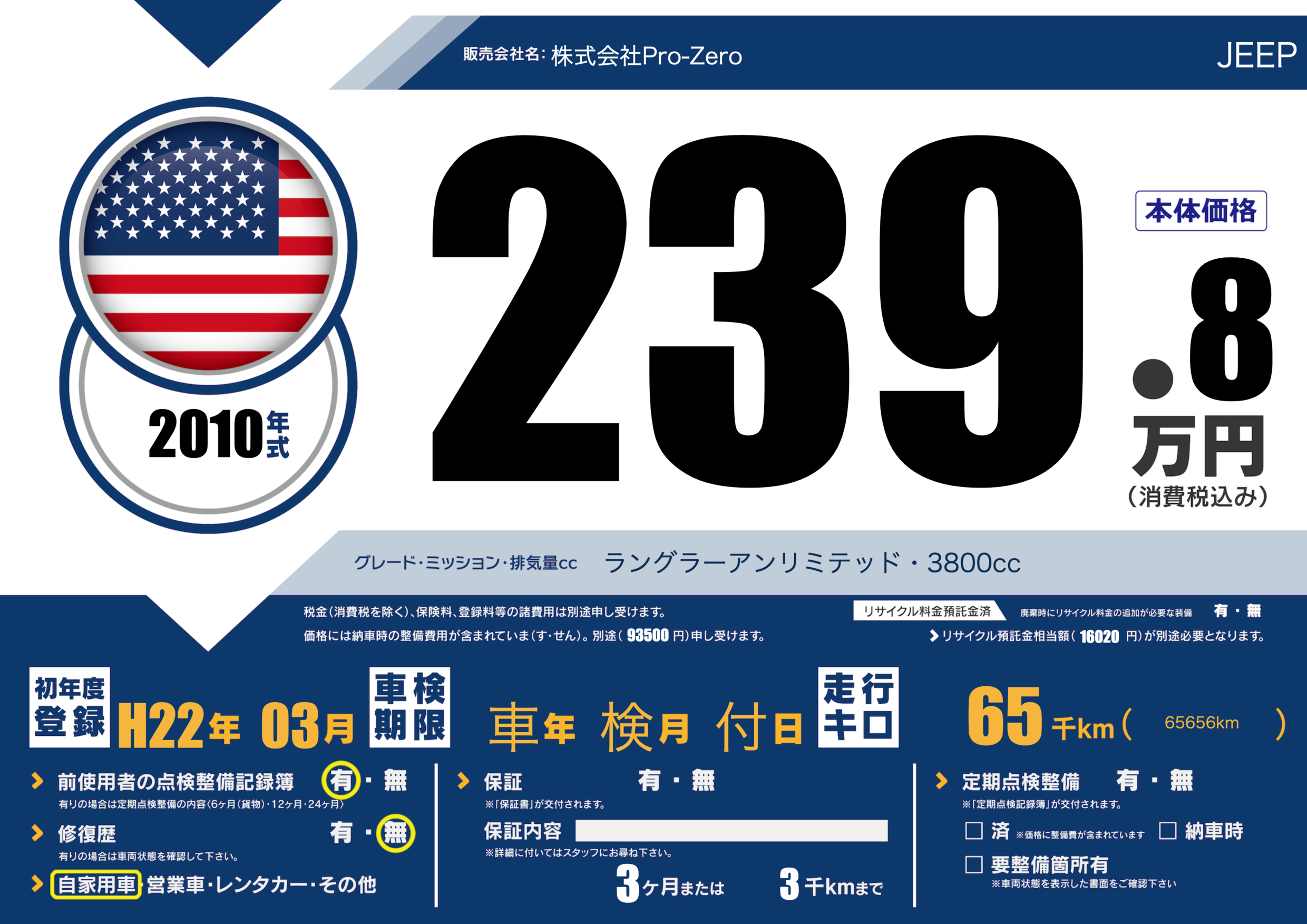 | 車名 | JEEP | グレード ミッション 排気量 |