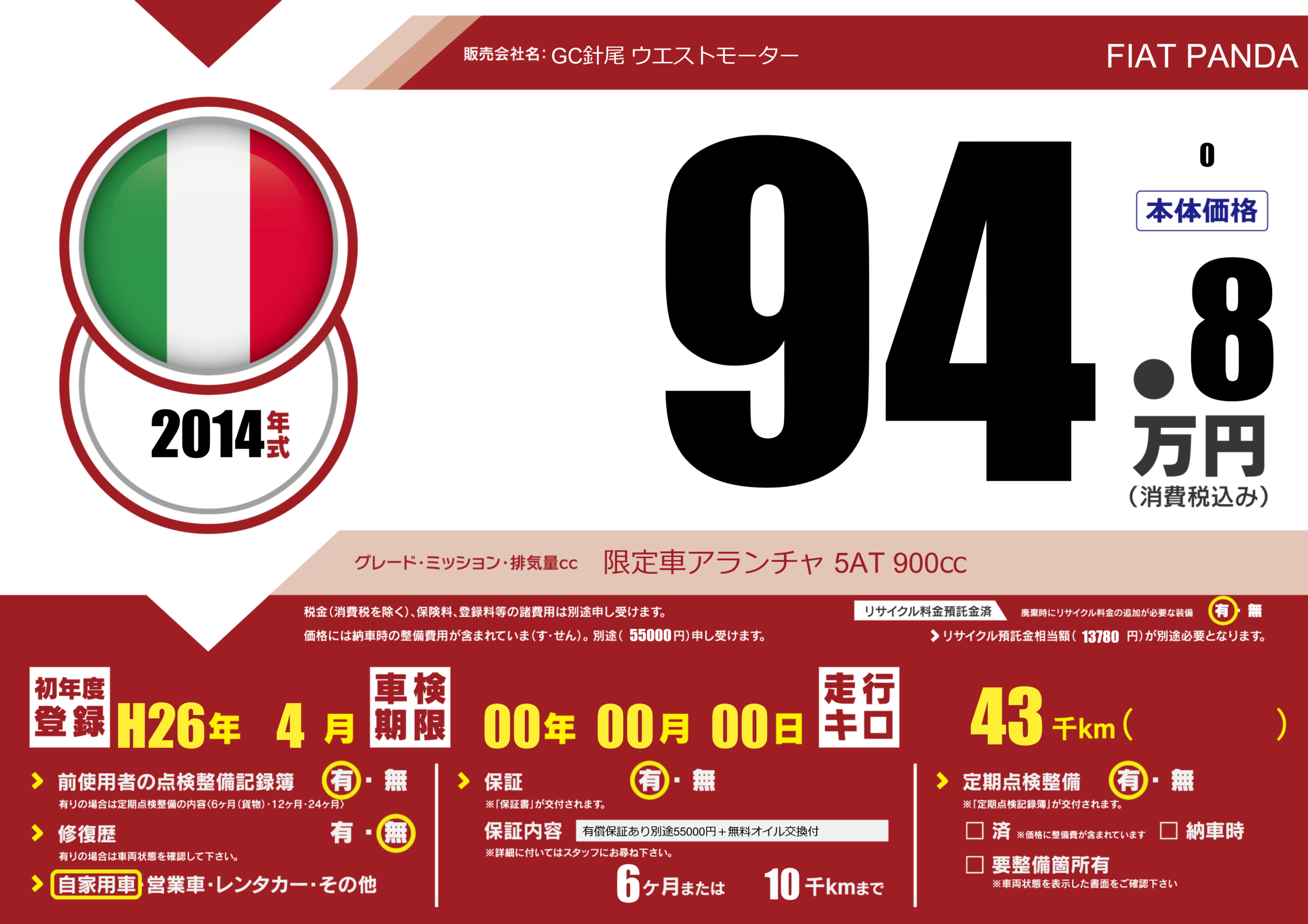 | 車名 | FIAT PANDA | グレード ミッション 排気量 |
