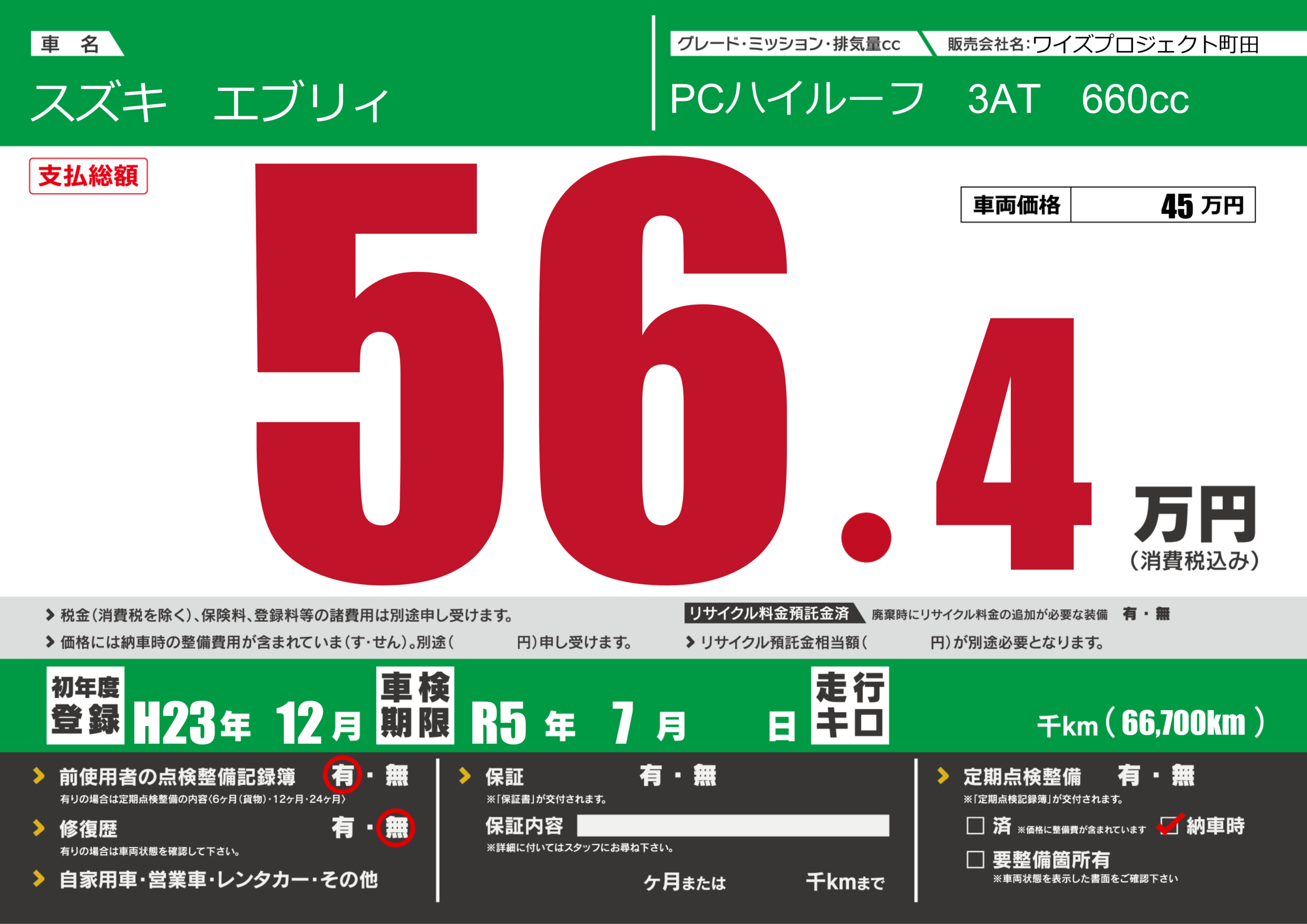| 車名 | スズキ エブリィ | グレード ミッション 排気量 |