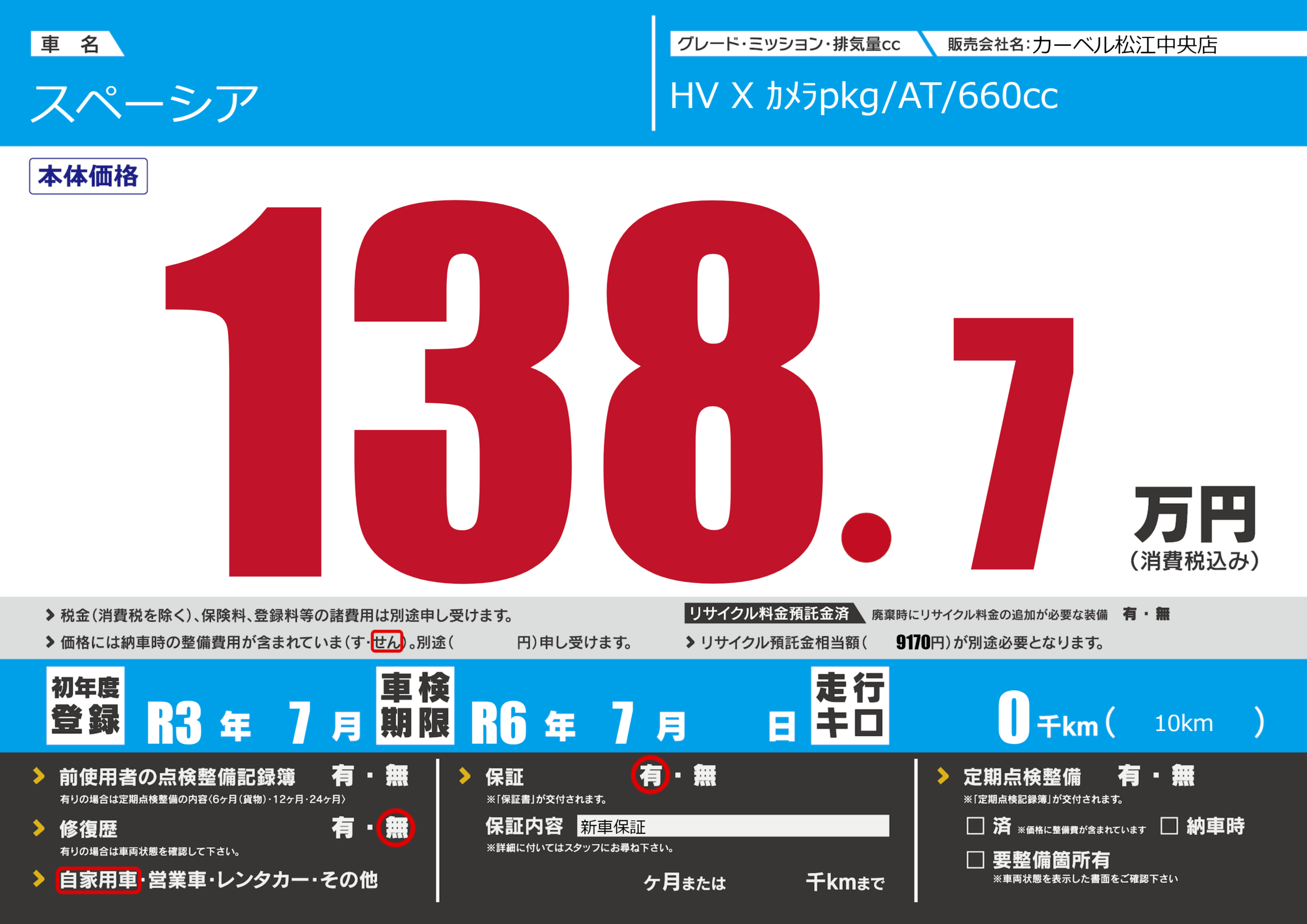 | 車名 | スペーシア | グレード ミッション 排気量 |